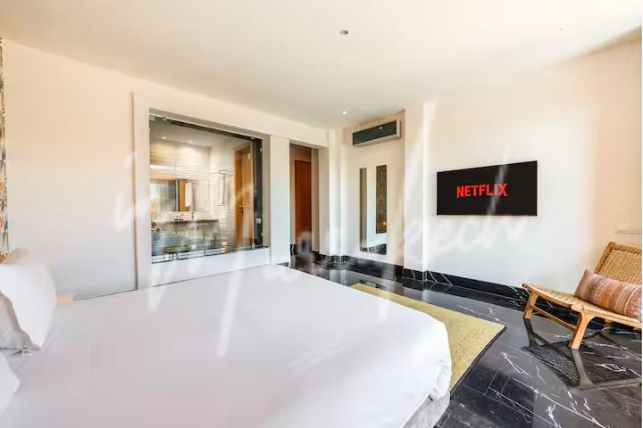 The villa features five suites with walk-in closets, as well as two additional bedrooms in the basement sharing one bathroom.