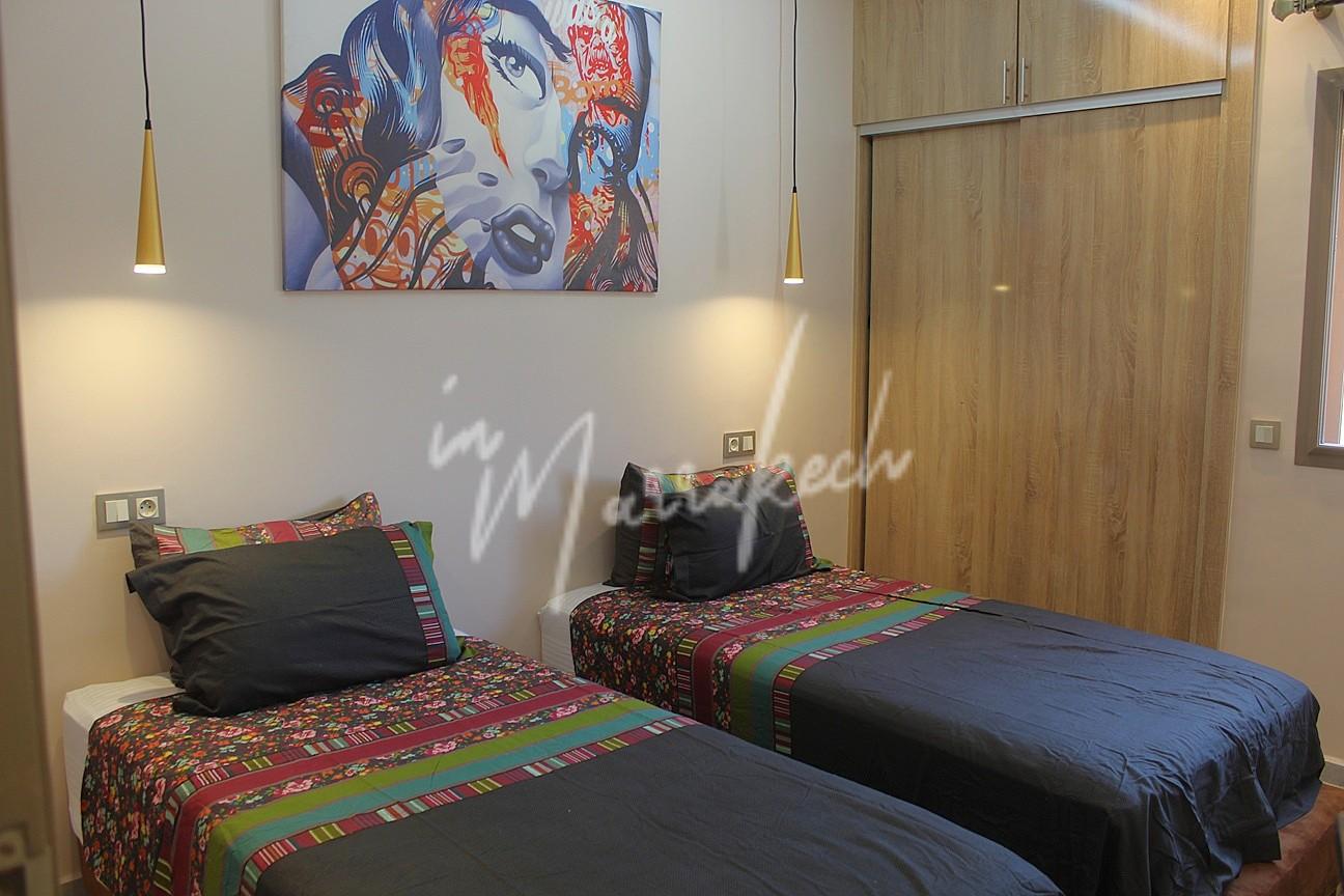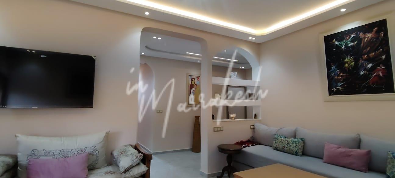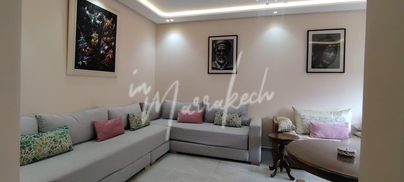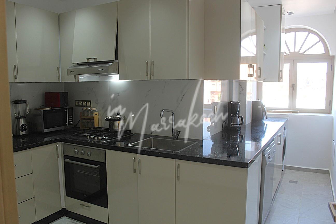 Description : Votre agence immobilière InMarrakech à le plaisir de vous proposer un appartement entièrement refait et meublé a neuf situé au 2e étage sans ascenseur dans une résidence avec des jardins au niveau de la boulangerie Alpha 2000 sur l’Avenue Allal El fassi comprenant une entrée , salon, une belle cuisine entièrement équipée ( Plaque , hotte four , frigo congélateur , micro-onde , lave-linge et lave-vaisselle ), deux chambres et une salle deau.