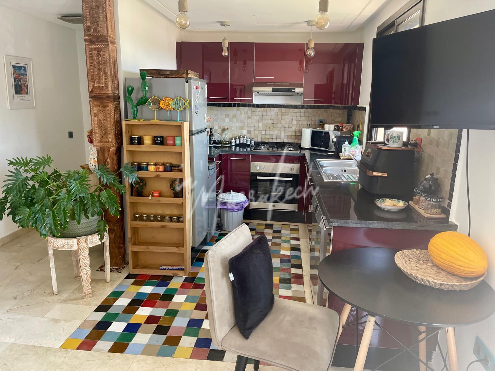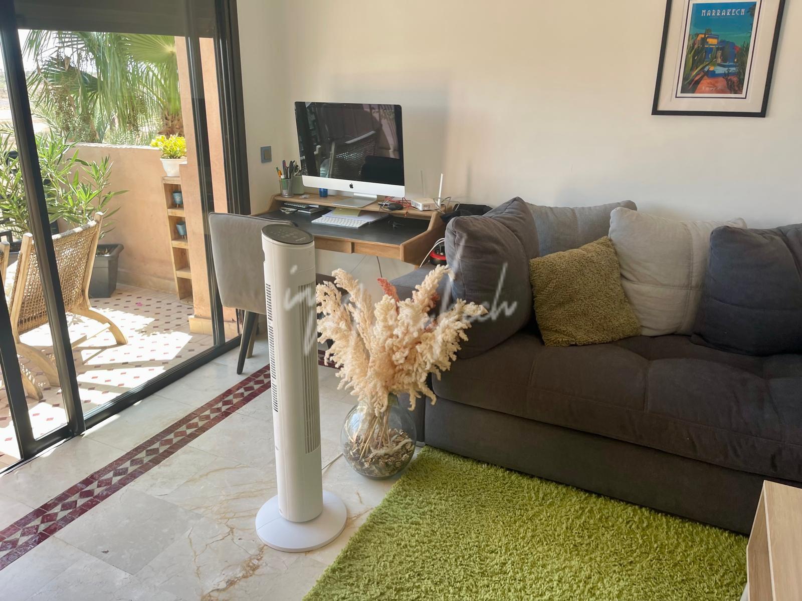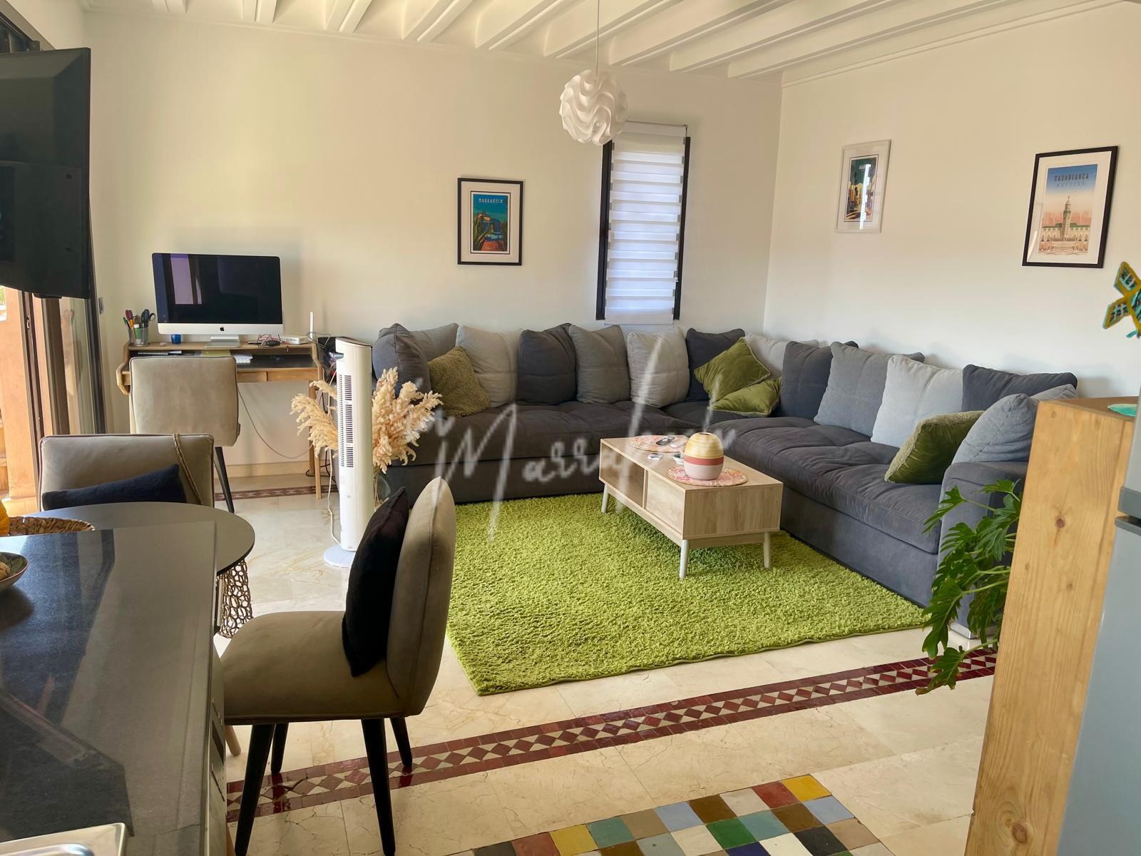 Description: Your real estate agency HB-immo in Marrakech is pleased to offer you, within a residence with a swimming pool, an apartment located on the 1st floor comprising: an entrance, a living room with terrace, an open-plan kitchen, two bedrooms (one with a terrace), and two bathrooms.