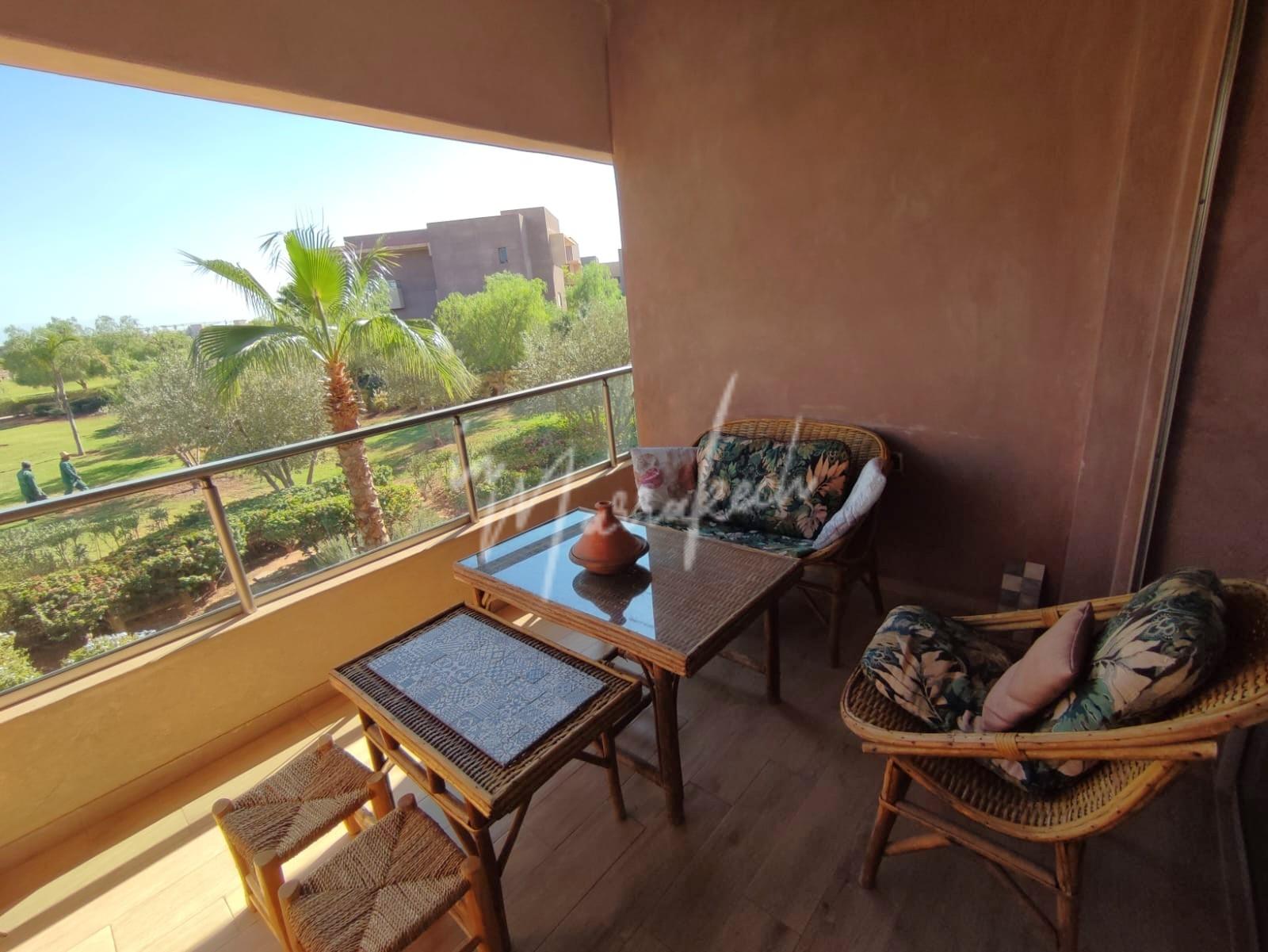 Description : HB.immo votre agence InMarrakech vous propose ce très bel appartement à Louer meublé situé au 1e étage dans une belle résidence Golfique.il se compose d’une entrée, un beau salon très belle terrasse belle orientation avec sa formidable vue sur l’atlas, une cuisine et pour la partie nuit deux chambres dont une parentale avec salle d’eau et une salle d’eau commune pour l’autre chambres.