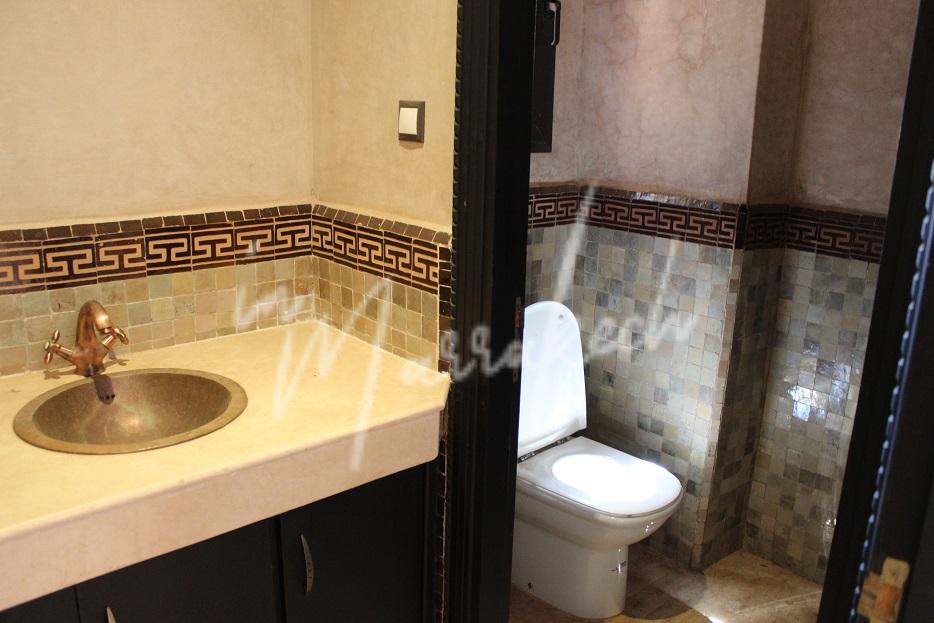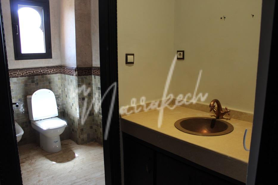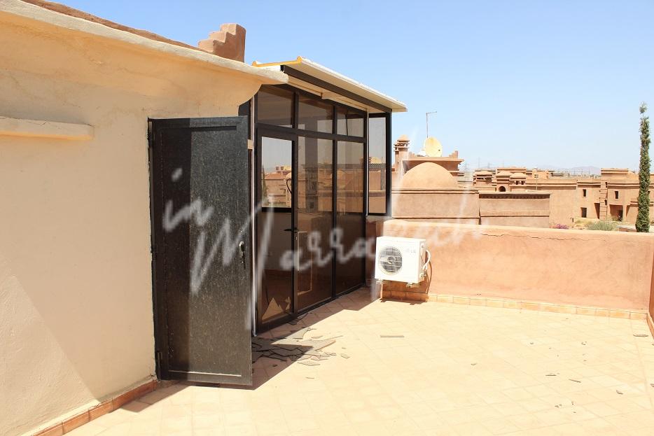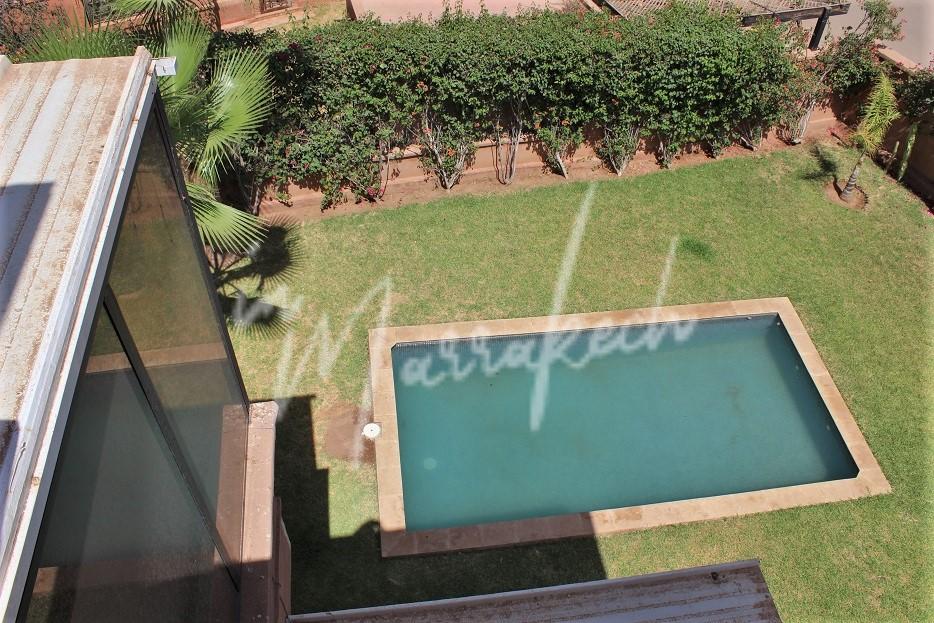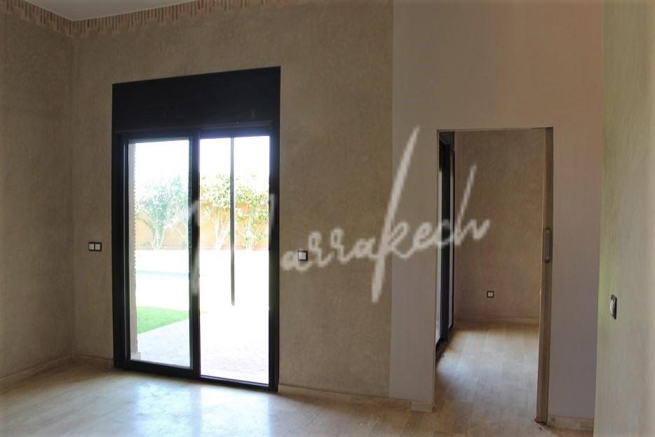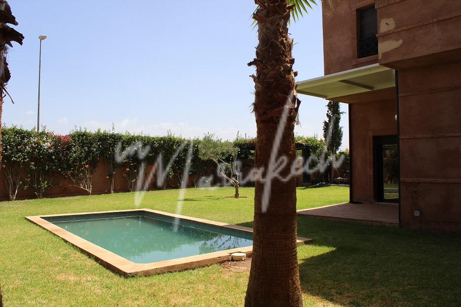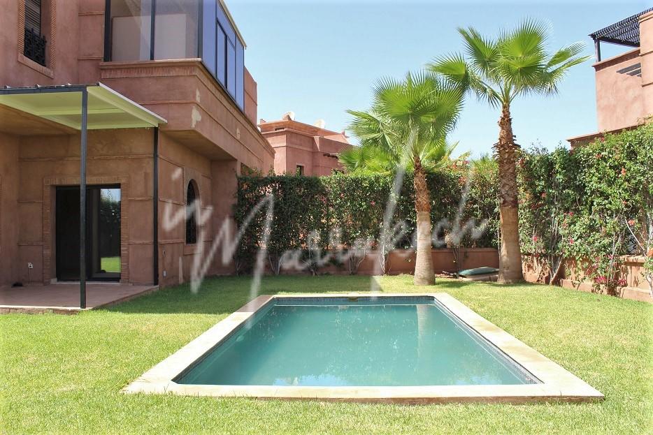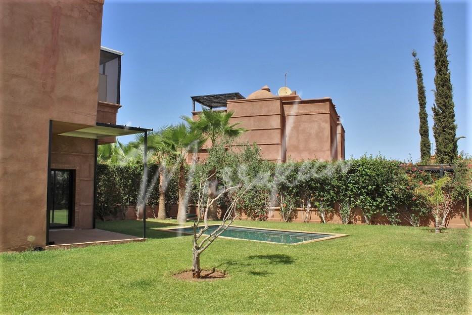 Description : Votre agence immobilière InMarrakech vous propose une belle petite villa édifié sur un terrain de 550m²dans une résidence golfique comprenant au rdc une entrée, salon, salle à manger ; toilette réception, cuisine et à l’étage trois chambres dont une avec terrasse fermée, une salle de bain et sur la terrasse au dessus une pergola.