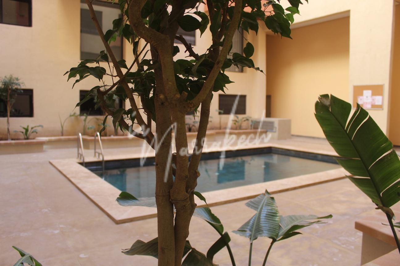 Description : Votre agence immobilière InMarrakech à le plaisir de vous proposer un joli duplex situé au Rdc dans une résidence avec piscine proche de la gare de train de Marrakech comprenant une entrée, salon avec une belle hauteur de plafond et sa cuisine américaine, une chambre et une salle d’eau et à l’étage deux chambres et une salle d’eau commune aux deux chambres.