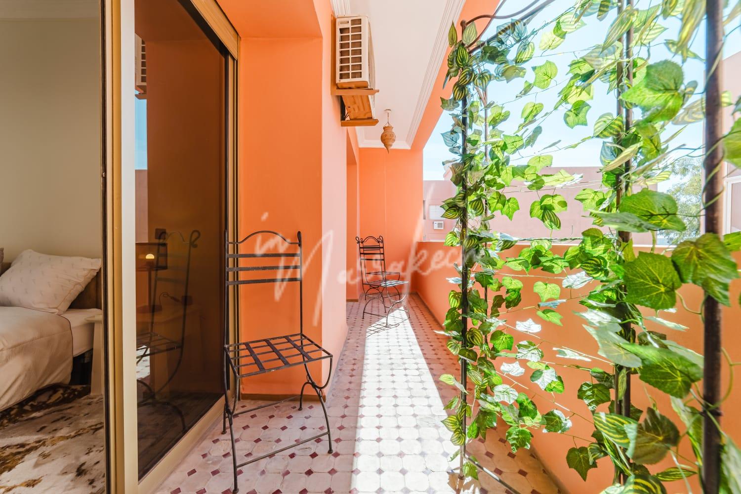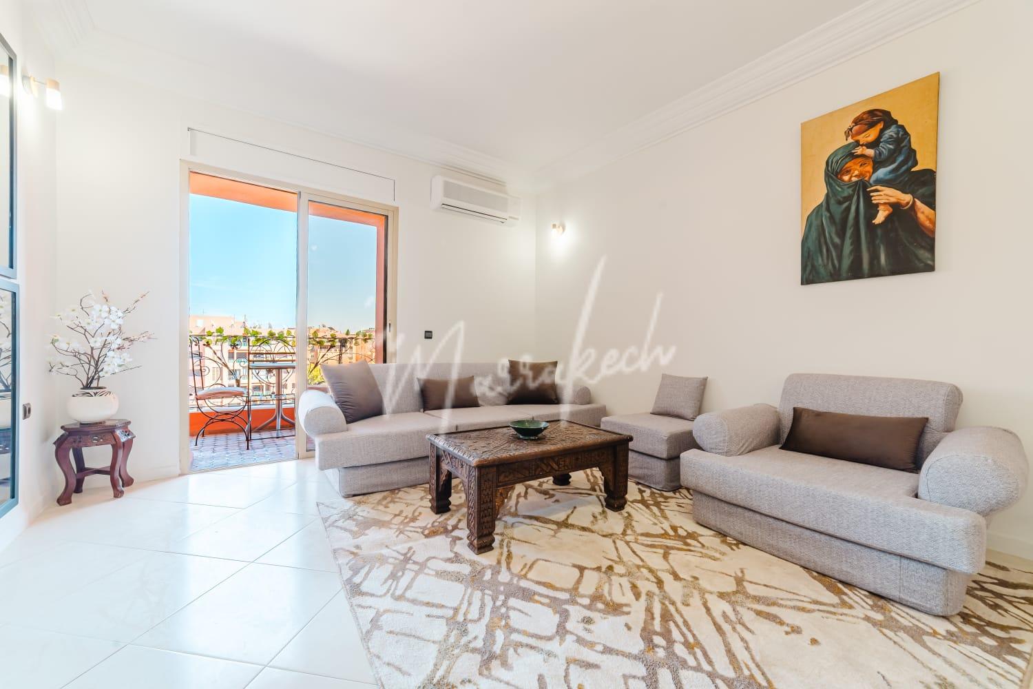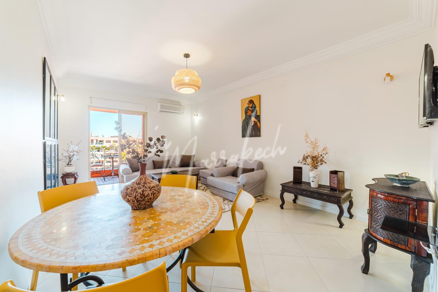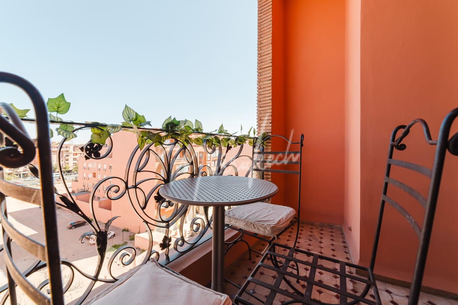Votre agence immobilière InMarrakech a le plaisir de vous proposer appartement meublé de 99 m² situé au 5ème et dernier étage d’une petite résidence de 5 niveaux avec ascenseur et peu de résidents. L’appartement comprend un salon, coin salle à manger, cuisine entièrement équipée, deux chambres, une salle de bain et un toilette supplémentaire et deux terrasses, l’une donnant sur une ruelle calme et tranquille et l’autre sur le boulevard Mohammed VI.