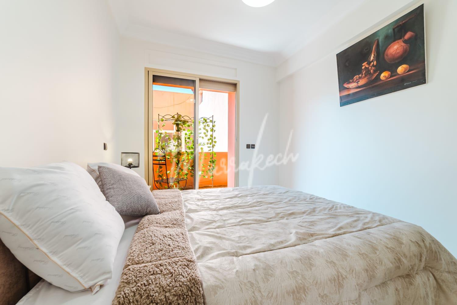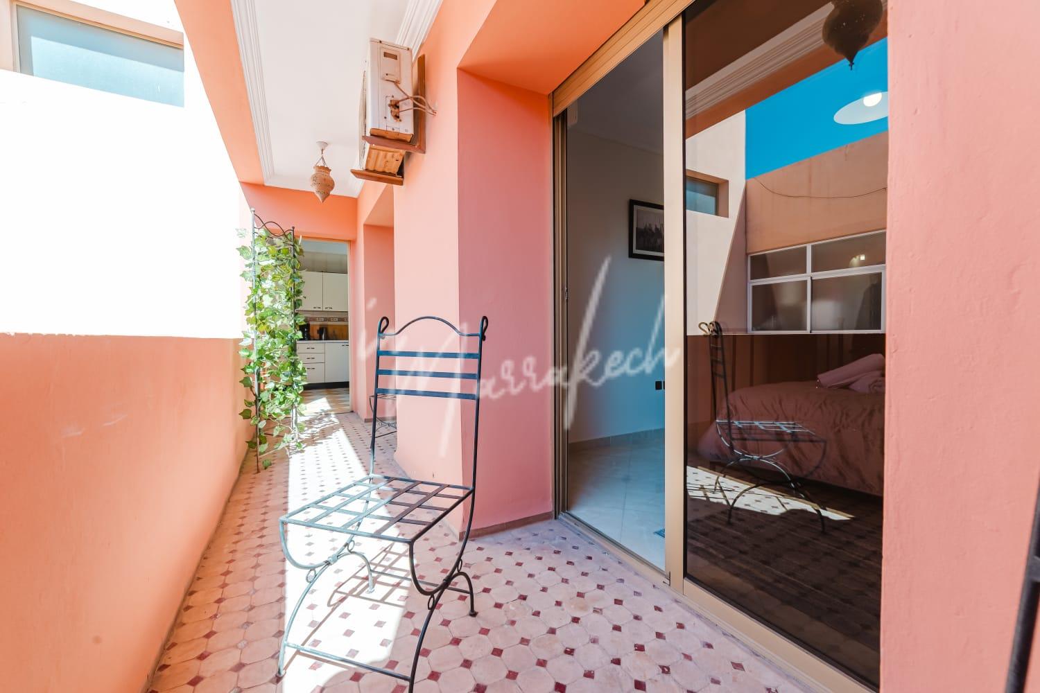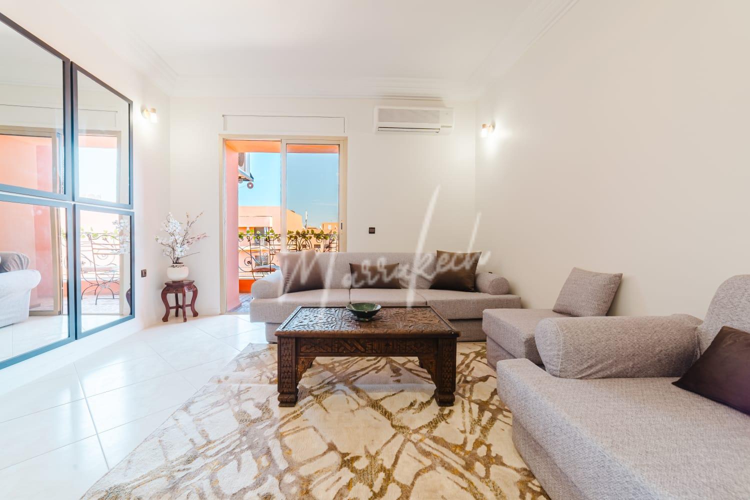 Votre agence immobilière InMarrakech a le plaisir de vous proposer appartement meublé de 99 m² situé au 5ème et dernier étage d’une petite résidence de 5 niveaux avec ascenseur et peu de résidents. L’appartement comprend un salon, coin salle à manger, cuisine entièrement équipée, deux chambres, une salle de bain et un toilette supplémentaire et deux terrasses, l’une donnant sur une ruelle calme et tranquille et l’autre sur le boulevard Mohammed VI.