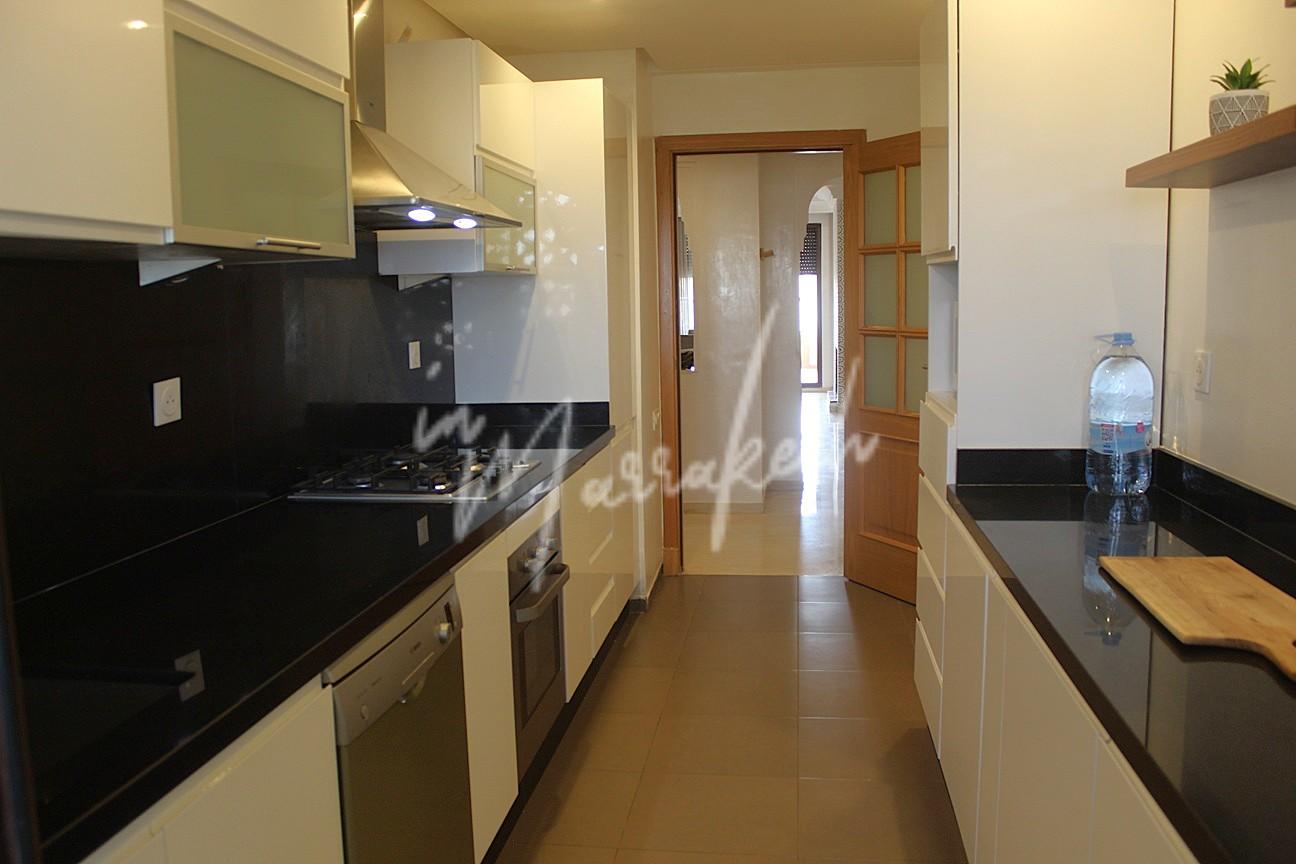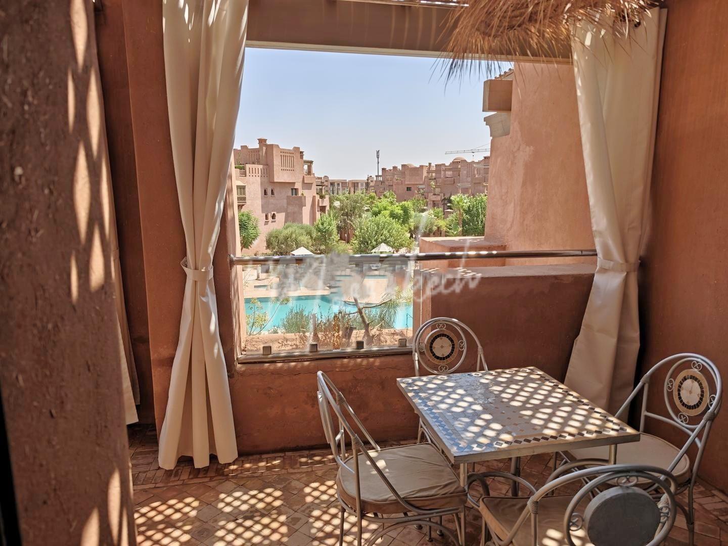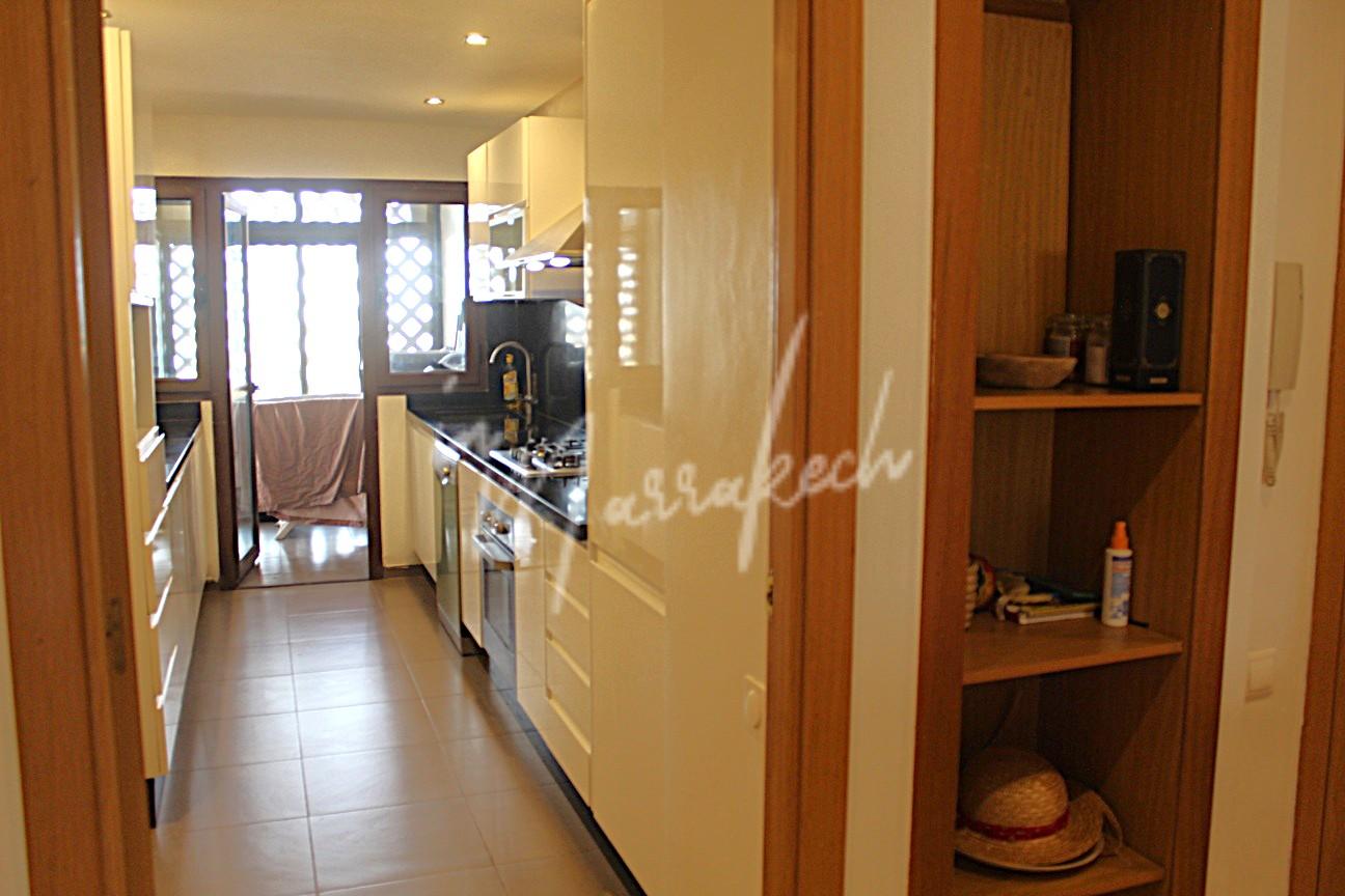 une cuisine entièrement équipée avec appareils haut de gamme, un beau séjour ,une grande terrasse avec une vue sur la piscine et les montagnes de l’Atlas , toilette réception, deux belle chambres avec salle d’eau.