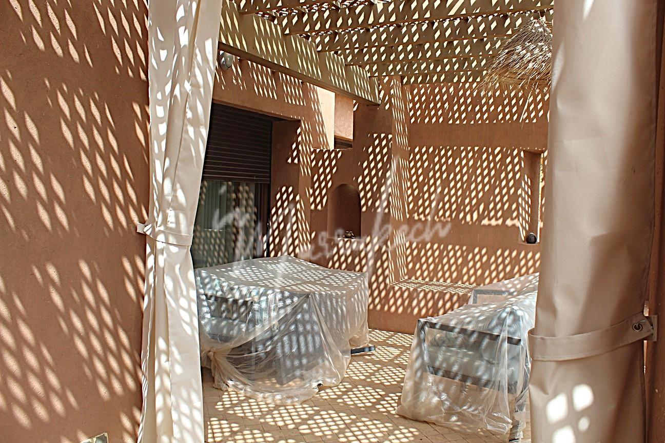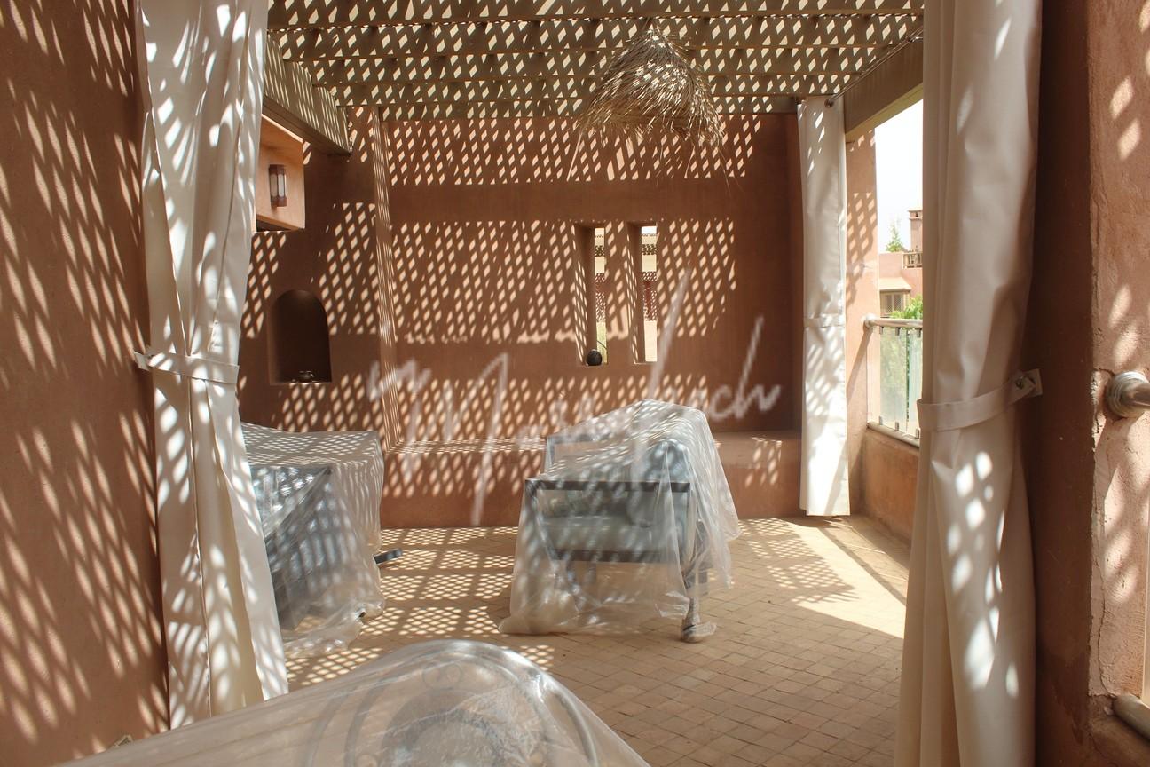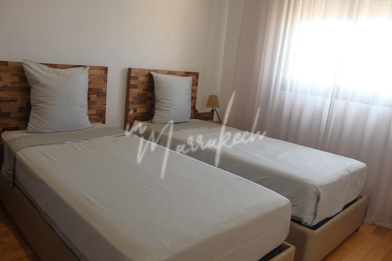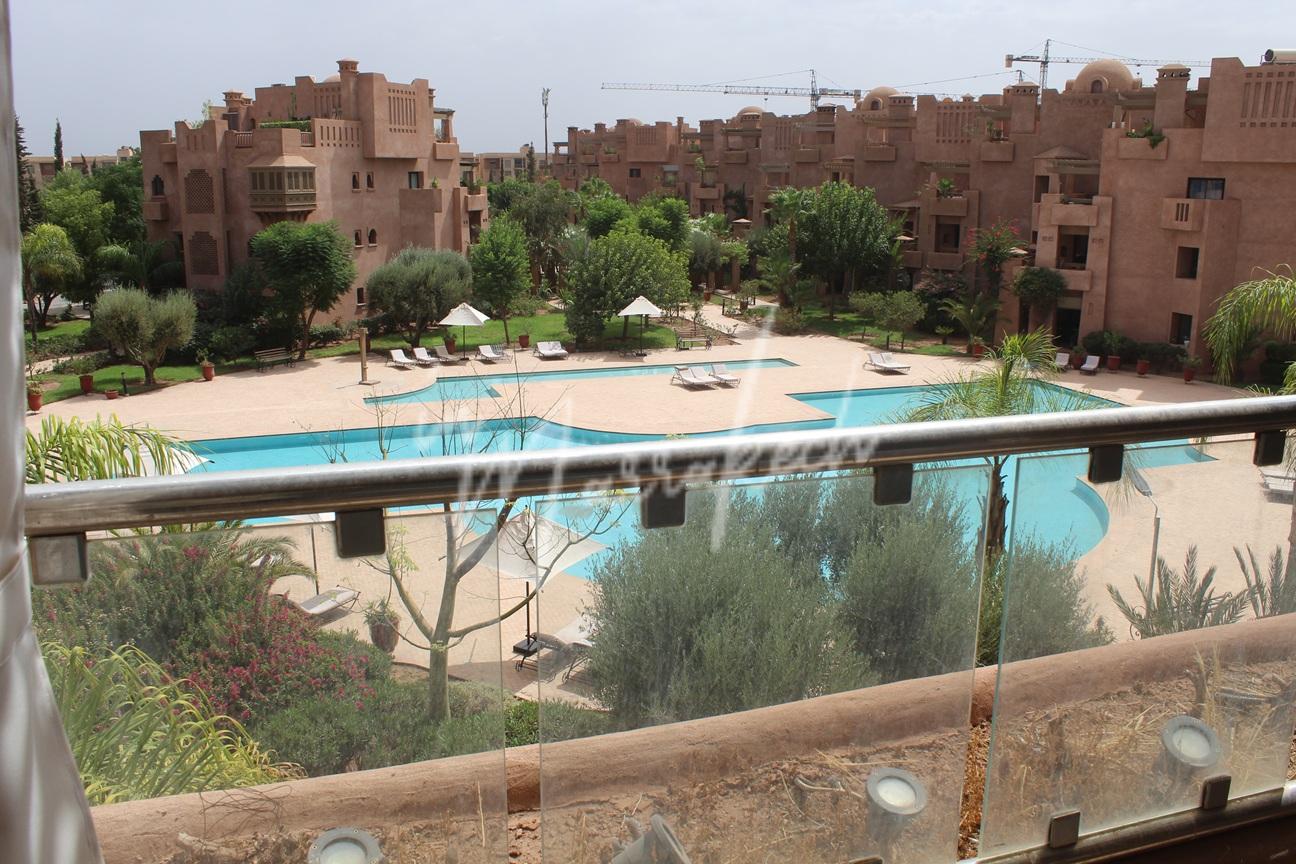 une cuisine entièrement équipée avec appareils haut de gamme, un beau séjour ,une grande terrasse avec une vue sur la piscine et les montagnes de l’Atlas , toilette réception, deux belle chambres avec salle d’eau.