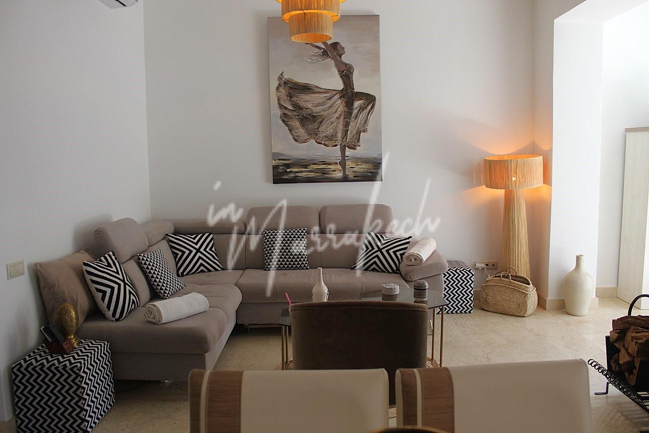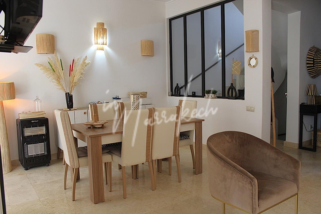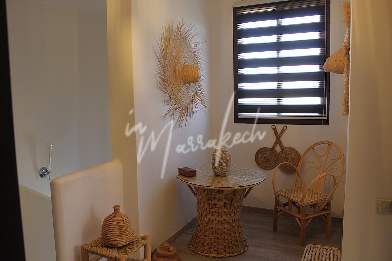 Description : Votre agence immobilière InMarrakech à le plaisir de vous proposer un magnifique pavillon meublé à 10 mn de Marrakech situé au Jardins de l'Atlas. Comprenant au rdc une entrée, cuisine, toilette réception, salon avec cheminée, un joli petit jardin privatif, A l’étage deux chambres avec terrasse, une salle d’eau et au sous-sol une chambre d’appoint avec salle d’eau.