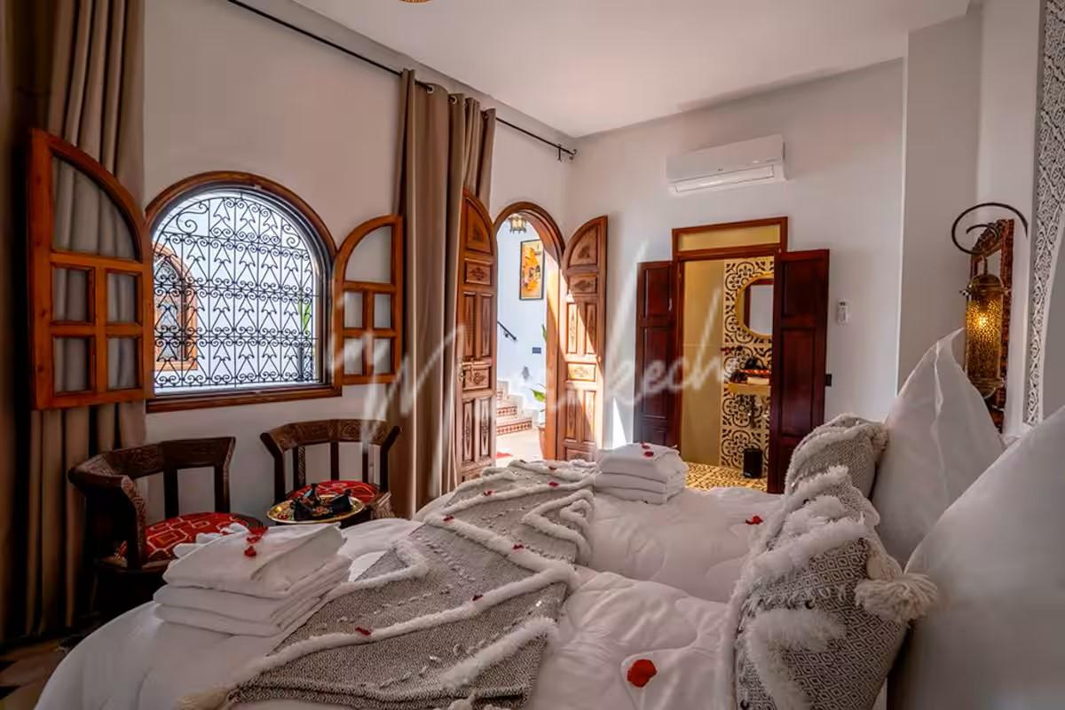 Description : Votre agence immobilière sur Marrakech InMarrakech à le plaisir de vous proposer à la Vente ce magnifique riad comprenant au rdc une cuisine ouverte sur le patio ; un salon, toilette réception et deux chambres avec salle d’eau et à l’étage trois chambres avec salle d’eau et au-dessus une terrasse aménager avec jacuzzi. Place de Parking à 200m² -JOIGNIABLE AUX HEURES D’OUVERTURE DU LUNDI AU VENDREDI DE 9H a 17H30 ET LE SAMEDI DE 9H A 13H. -N’hésitez pas à nous contacter au plus vite pour visiter ce bien ou d’autre produit similaire pouvant vous convenir ! En cas de Vente 2/5% d’honoraire agence sera perçu !