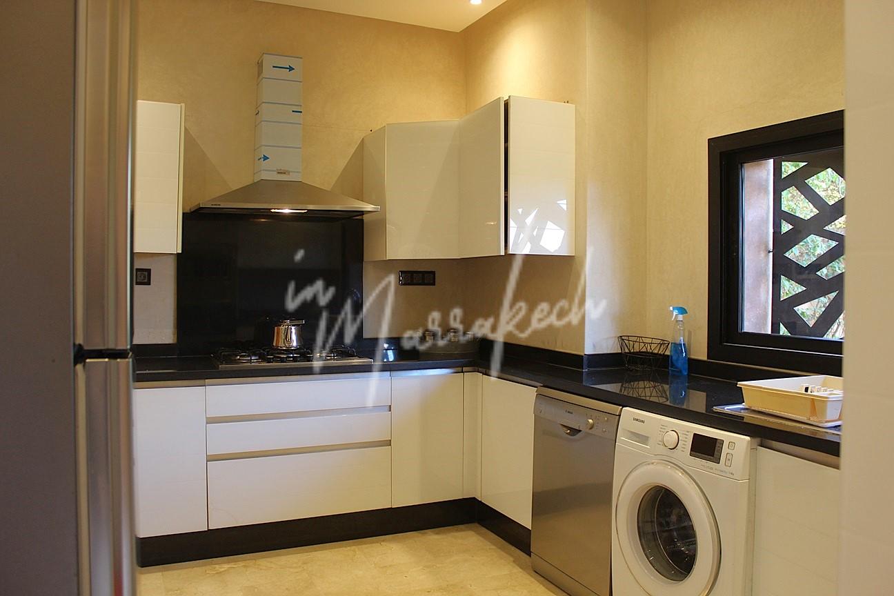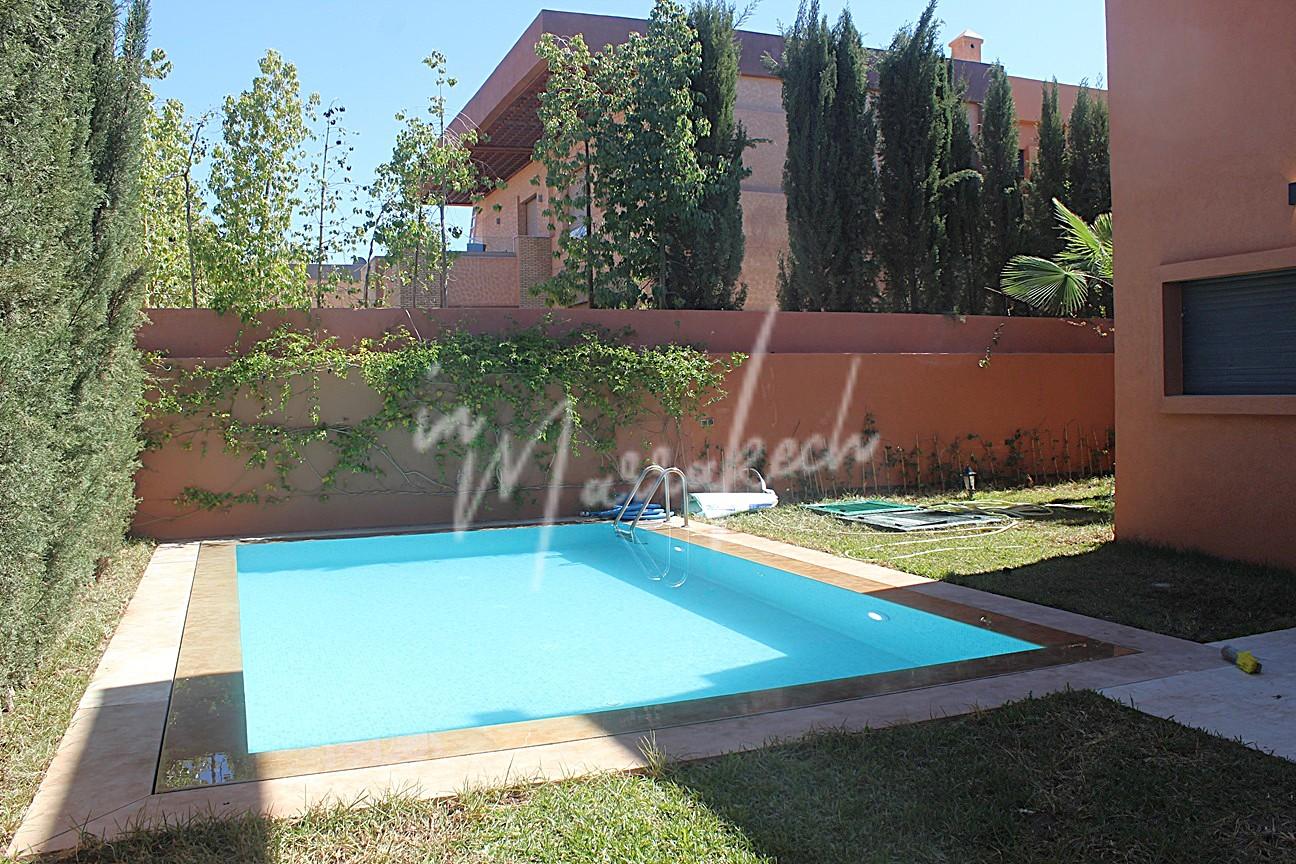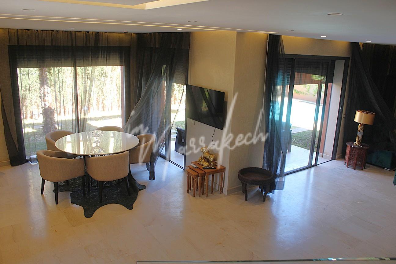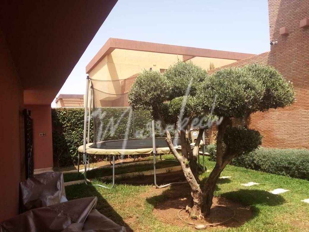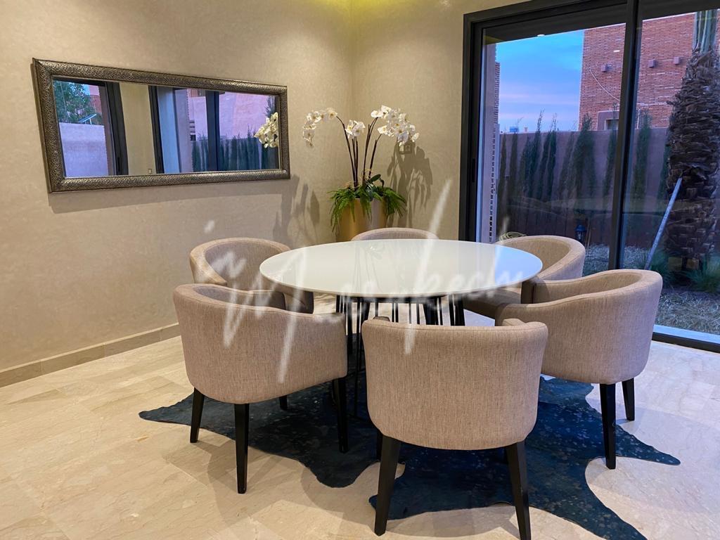 Description : votre agence immobilière InMarrakech vous propose à la LOCATION une très jolie villa moderne situé dans un domaine golfique situé à 10 minutes de Marrakech comprenant un vaste séjour, une superbe cuisine, toilette réception et à l’étage la villa vous offre trois magnifique chambres dont une parentale avec dressing, salle de bain et terrasse et une salle d’eau pour les deux autres chambres.