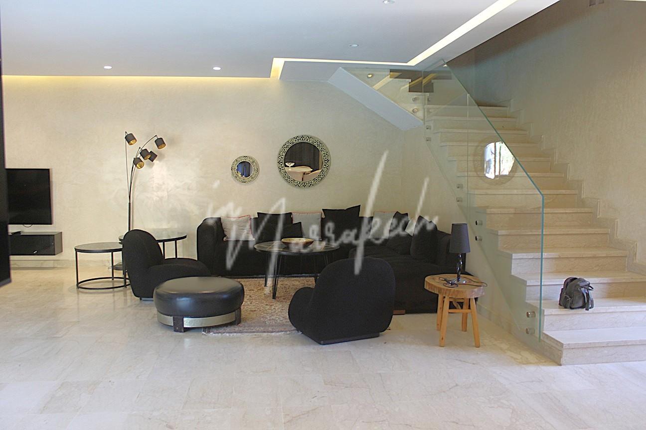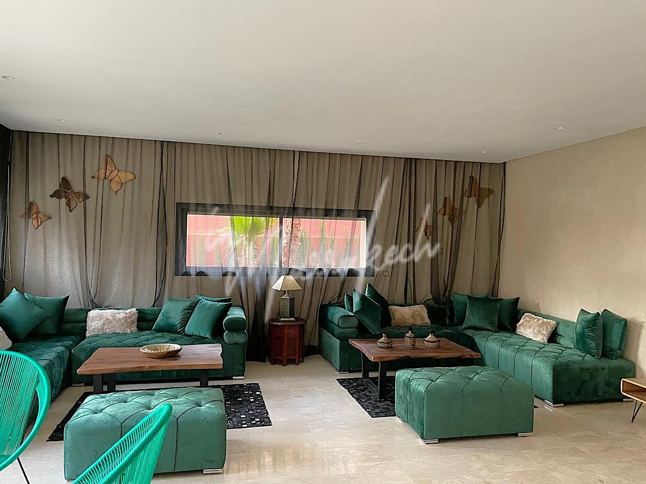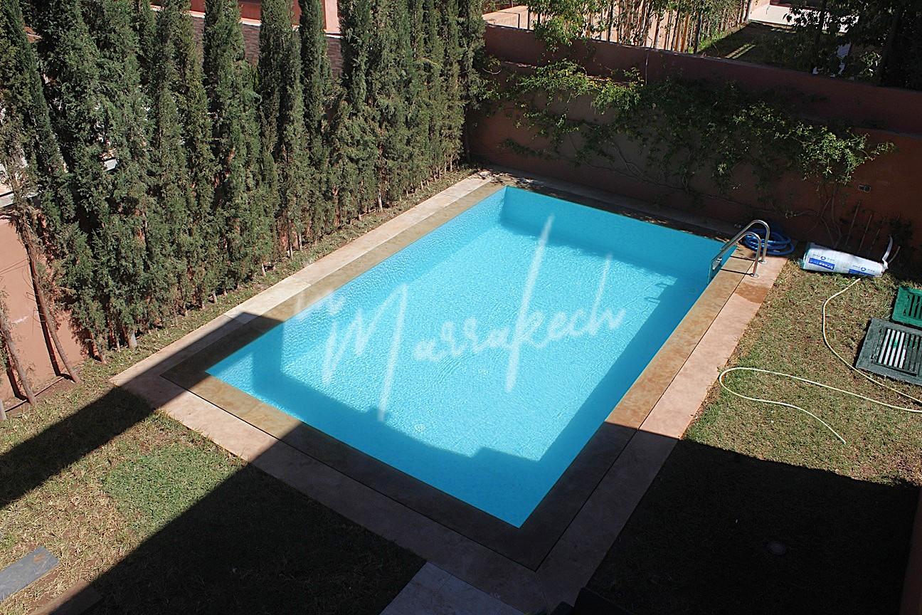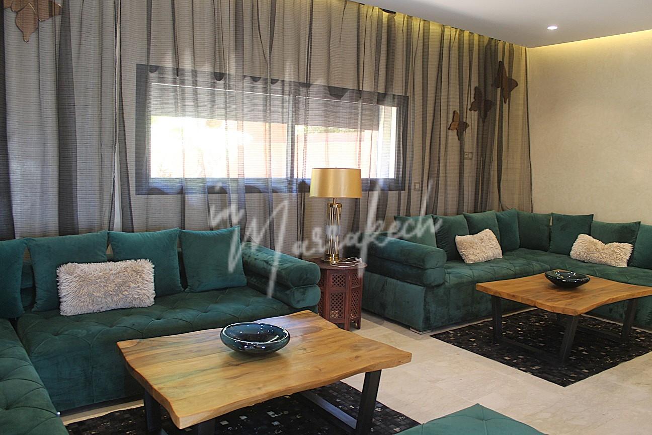 Description : votre agence immobilière InMarrakech vous propose à la LOCATION une très jolie villa moderne situé dans un domaine golfique situé à 10 minutes de Marrakech comprenant un vaste séjour, une superbe cuisine, toilette réception et à l’étage la villa vous offre trois magnifique chambres dont une parentale avec dressing, salle de bain et terrasse et une salle d’eau pour les deux autres chambres.