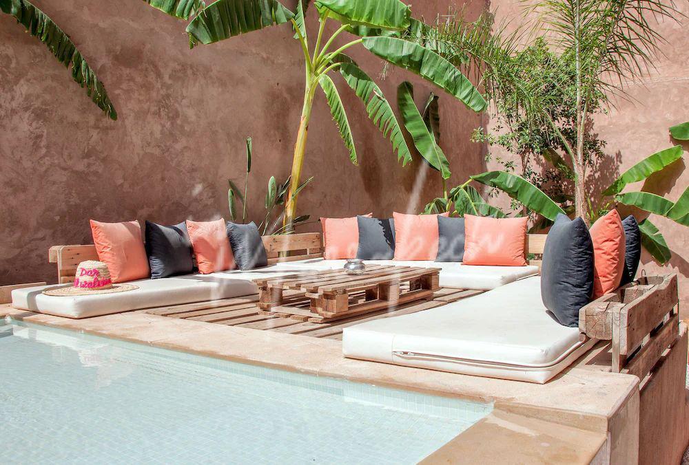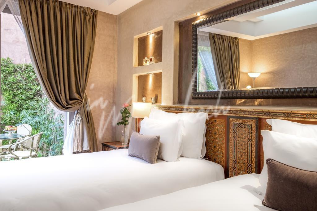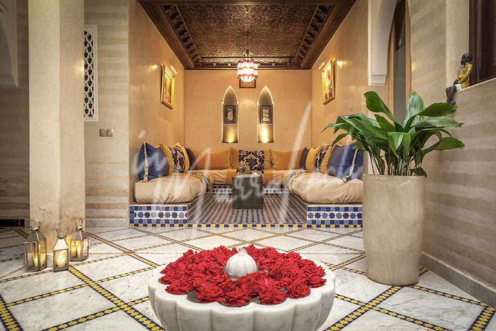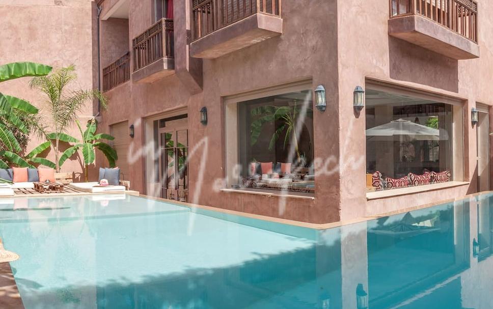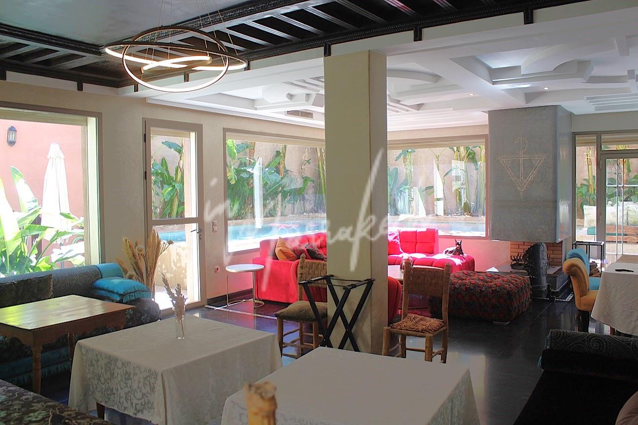 Description : Votre agence immobilière HB-immo sur Marrakech à le plaisir de vous proposer une luxueux et raffiné maison d’hôte à Louer en Location Gérance comprenant salon servant de restaurant dont une salle de réception, cuisine, toilette réception, bureau, sept suites somptueuses chacune avec salle de bain privée et au-dessus un appartement avec salon et sa cuisine américaine, toilette réception, deux chambres avec salle d’eau et une terrasse solarium le charme marocain.