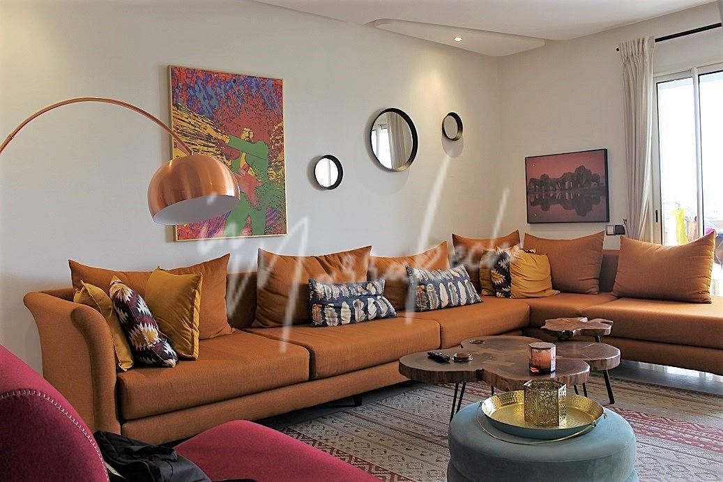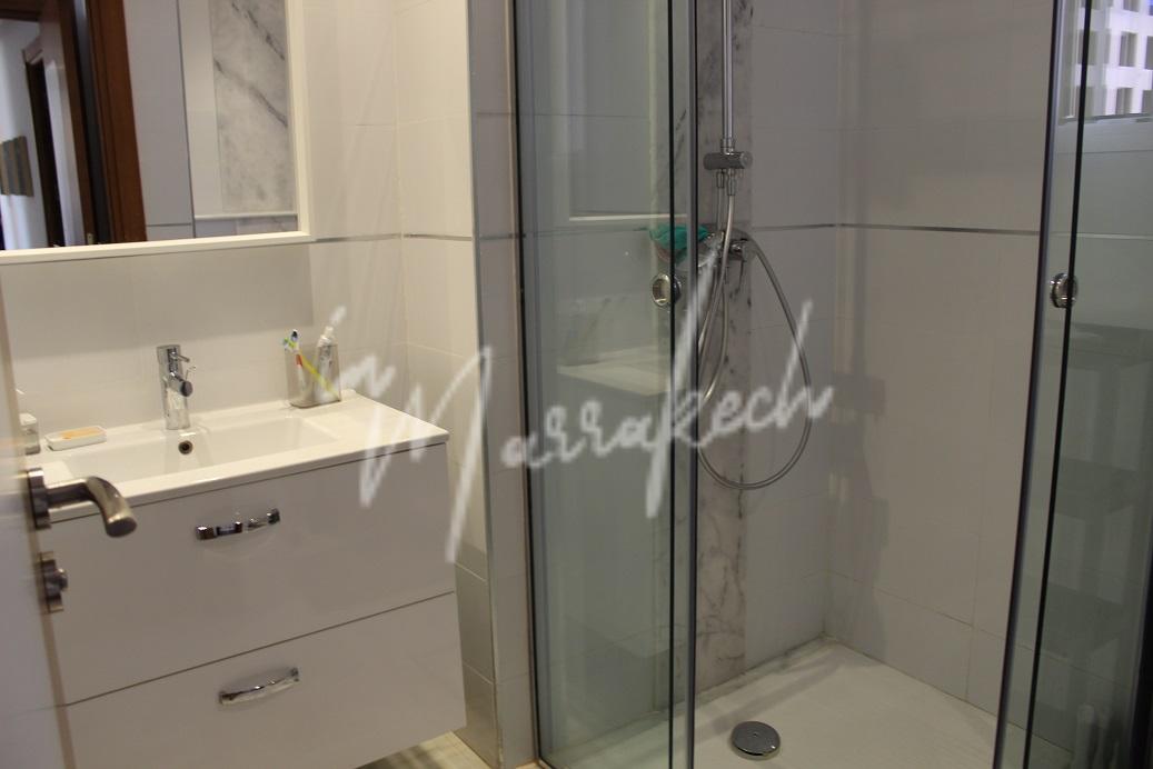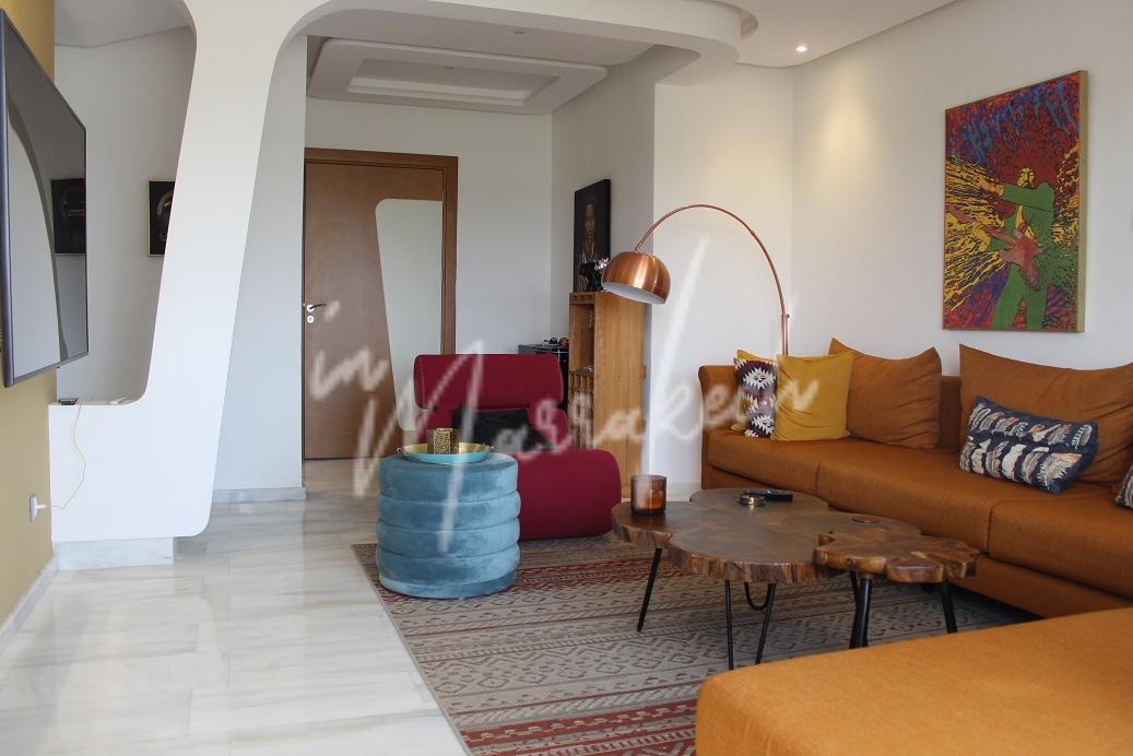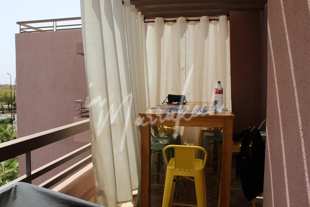 Description : votre agence immobilière InMarrakech vous propose un appartement neuf et meublé avec goût à la location longue durée. Il se trouve dans la zone touristique Agdal, sur l'avenue Mohammed 6. L'appartement situé au 2e étage dans une jolie résidence avec ascenseur. Disposant d'un salon ensoleillé, donnant sur une grande terrasse orientée plein sud sans vis à vis avec vue dégagée sur l’atlas équipée de canapés et dune grande table, de deux chambres dont une parentale avec salle d’eau et petite terrasse, dune 2e salle d’eau pour l’autre chambre, une cuisine bien équipée avec buanderie. La résidence est sécurisée, et est dotée de piscines et de jardins arborés.