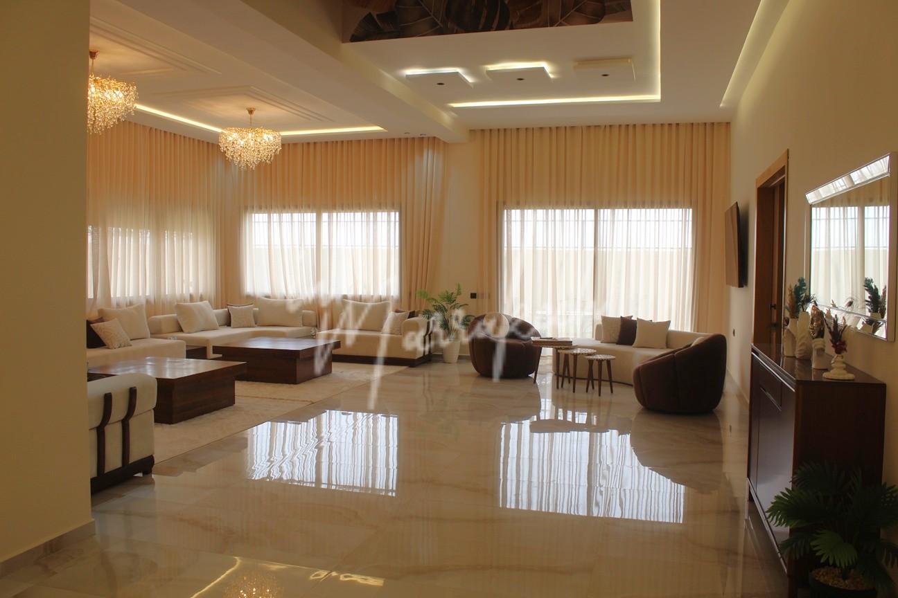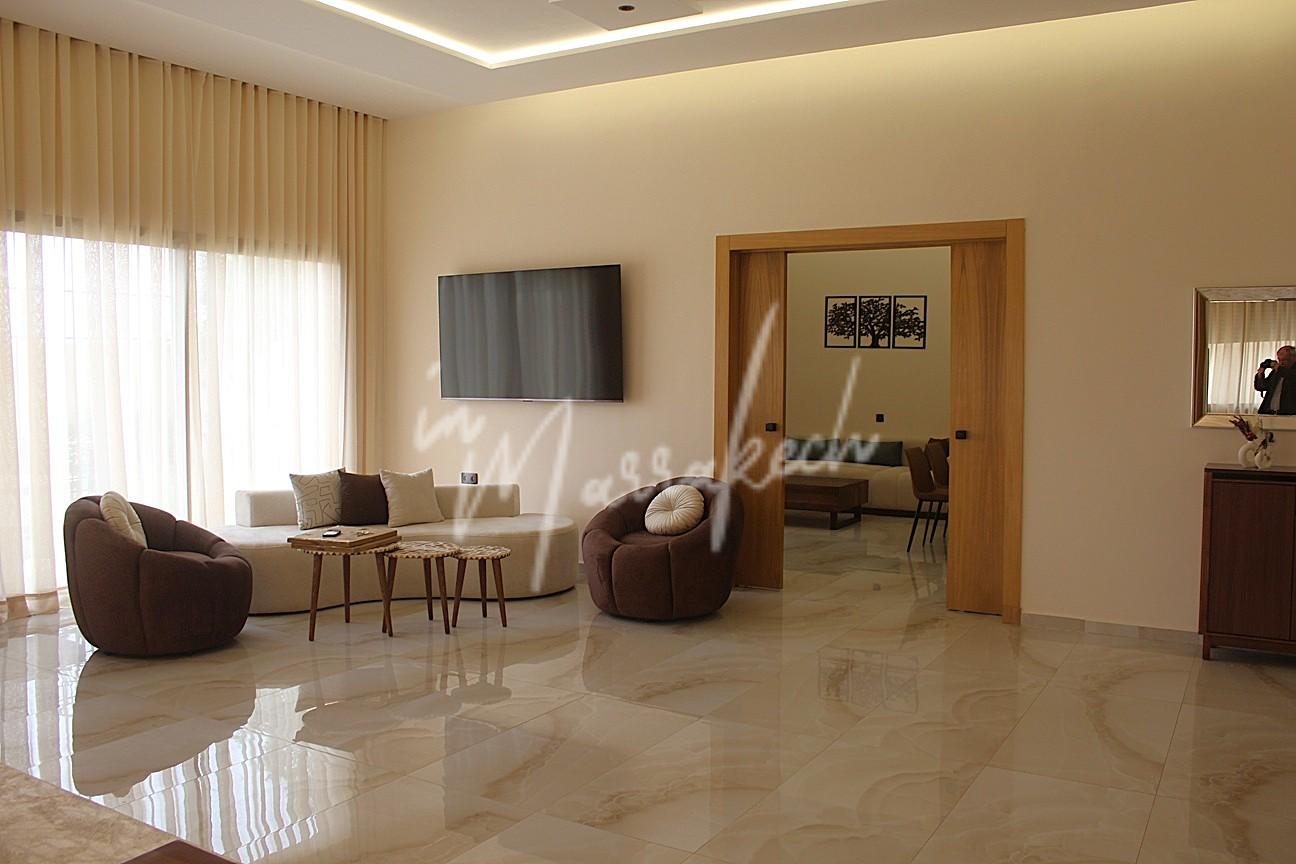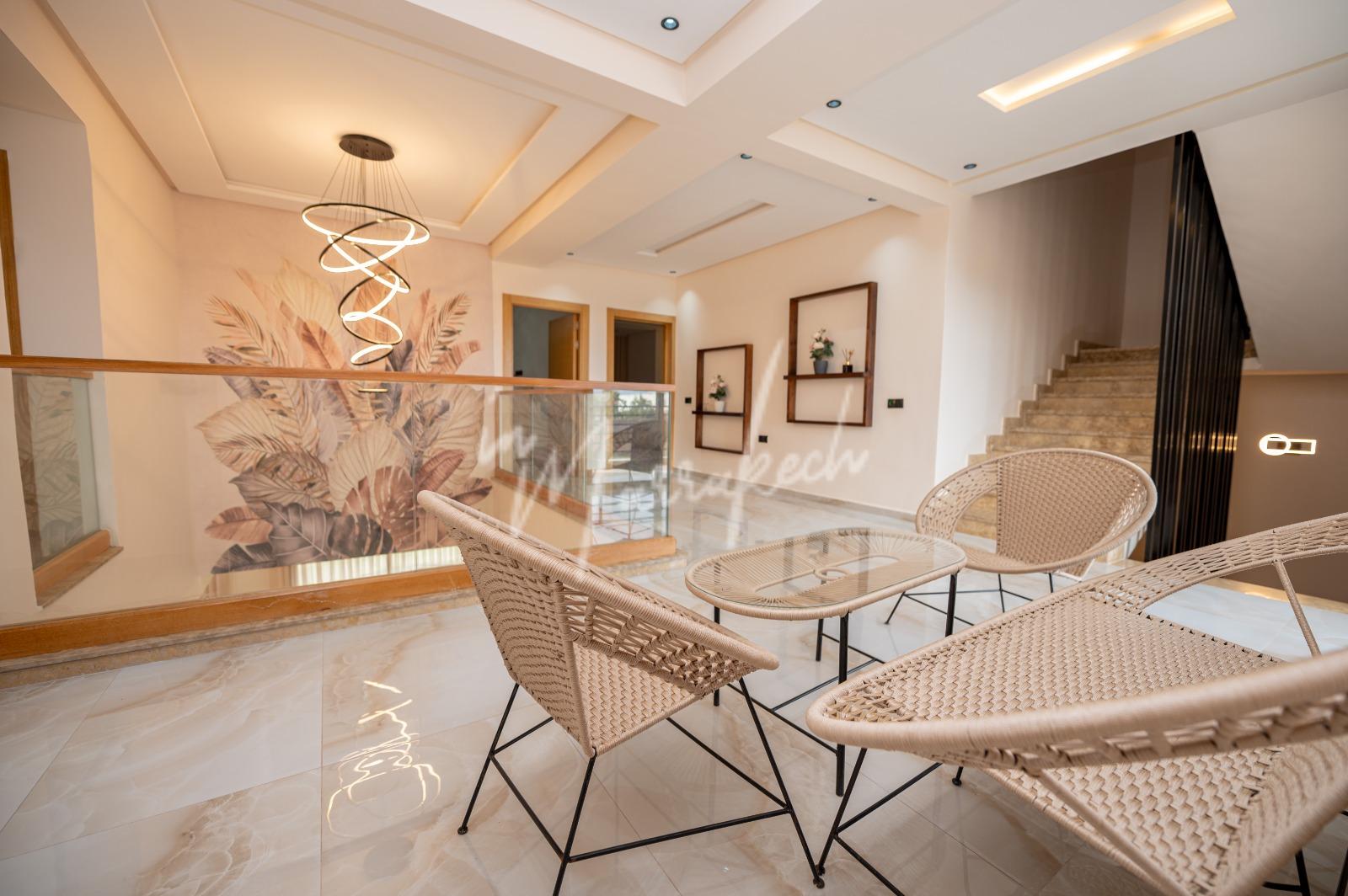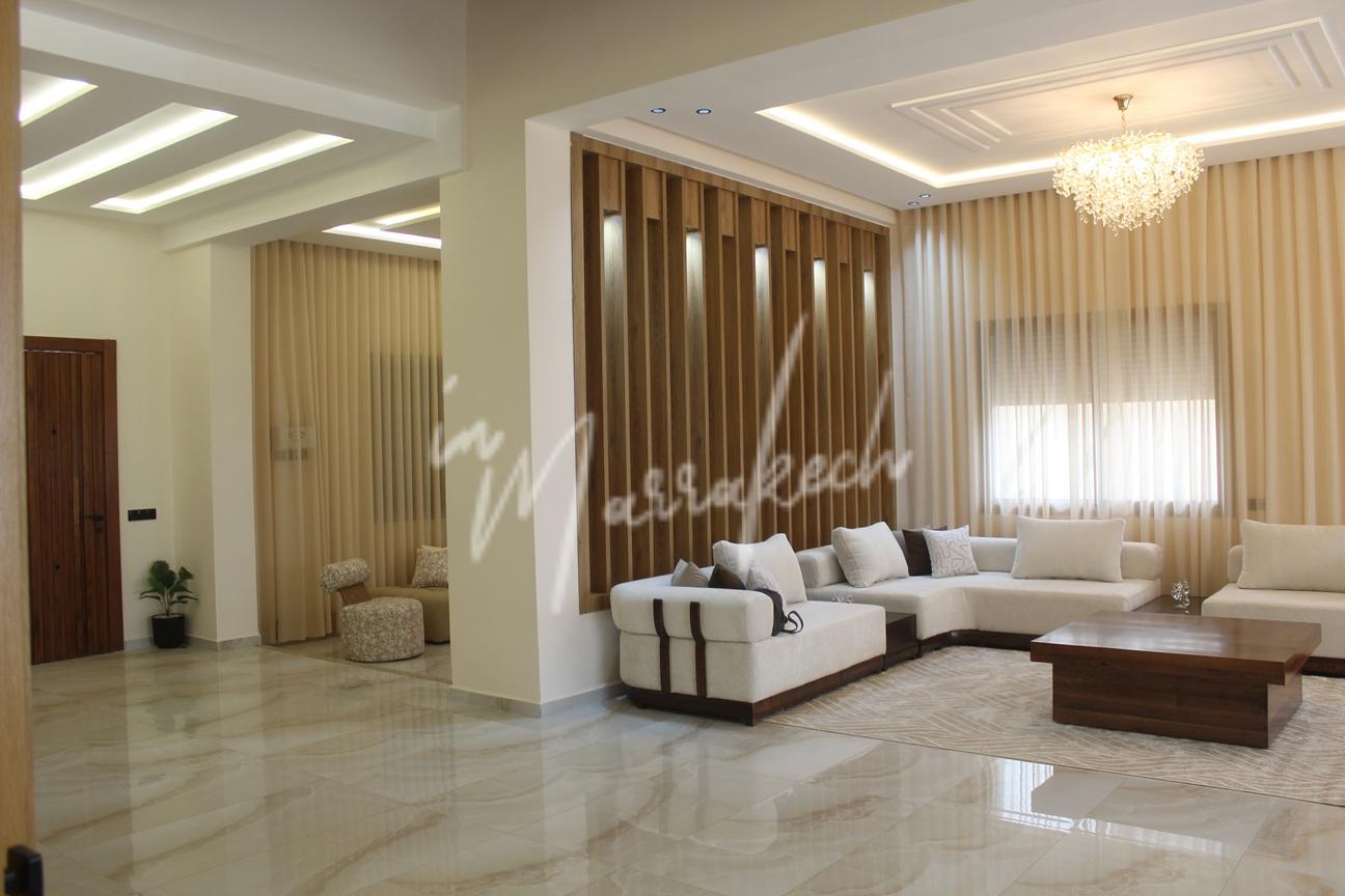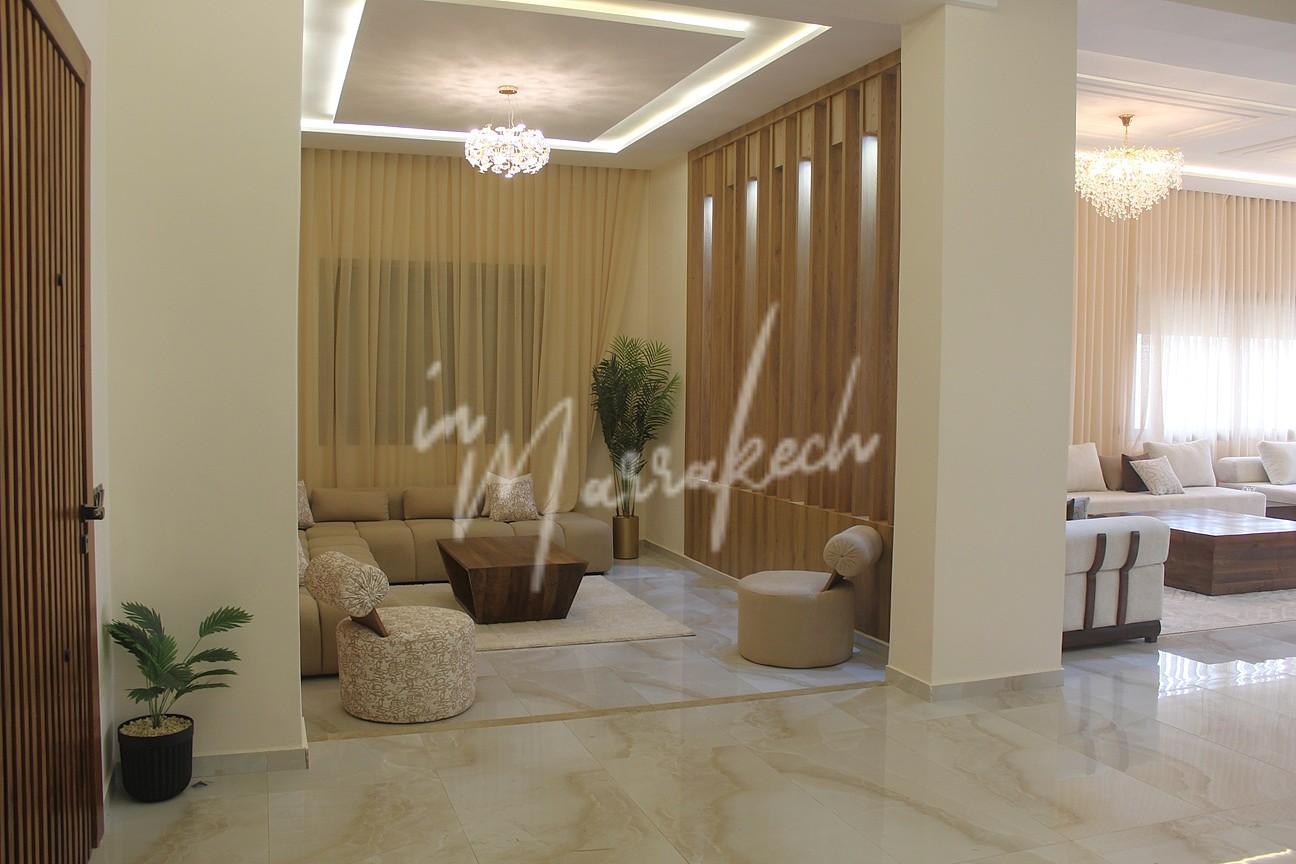Description : Votre agence immobilière InMarrakech à le plaisir de vous proposer une belle et grande villa situé dans un domaine comprenant au rdc deux salons, cuisine américaine avec un autre salon, toilette réception et à l’étage quatre chambres et trois salle d’eau.