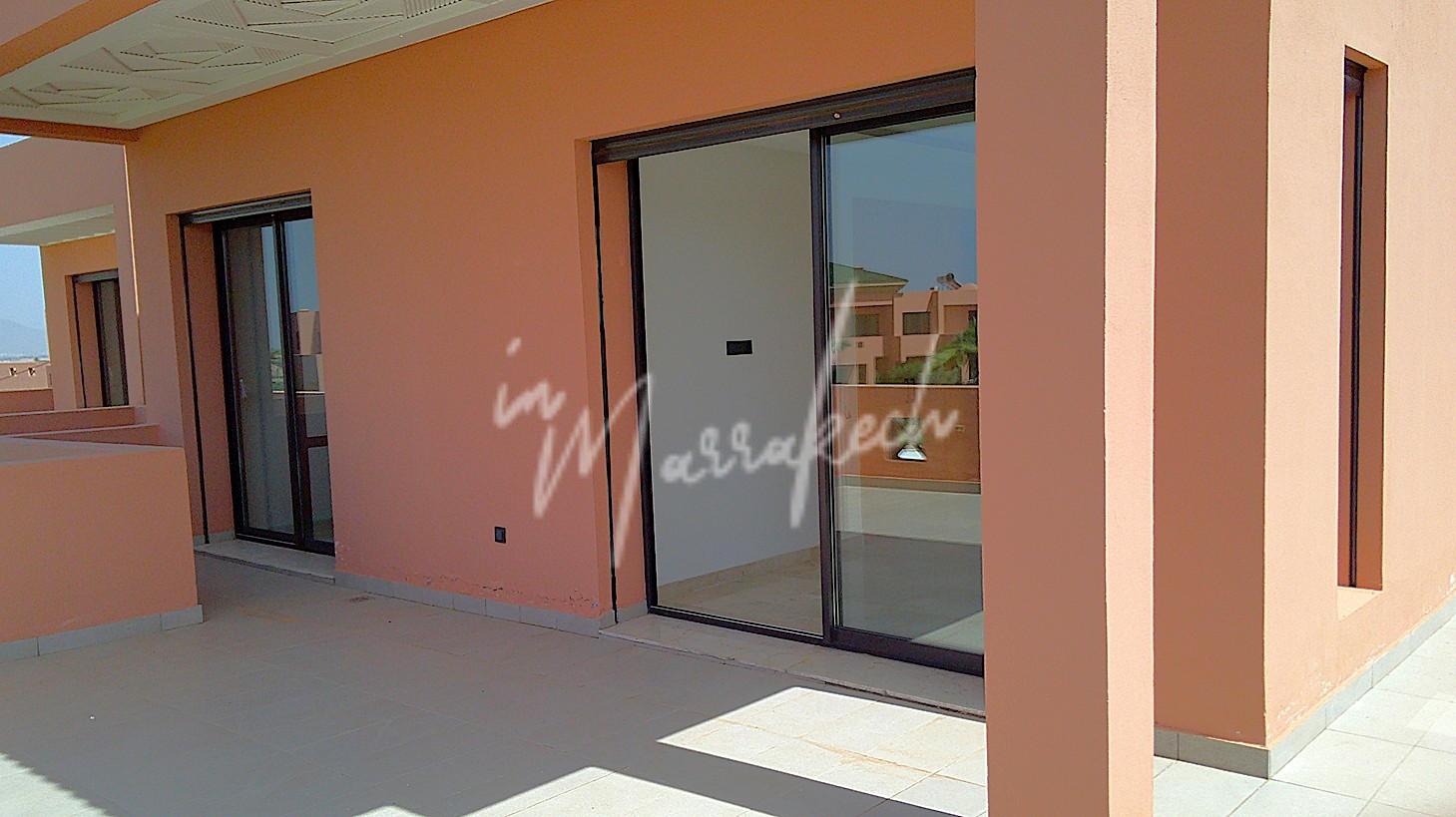 -une terrasse privative et d’un jardin paysager. Une magnifique piscine plage de 40 mètres de long et d’un service de sécurité 24h/24 et d’un parking.