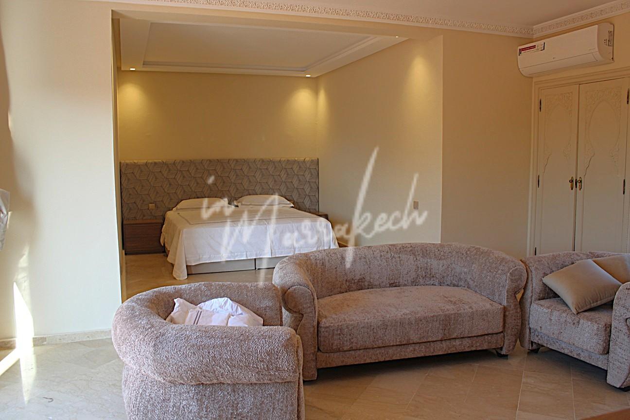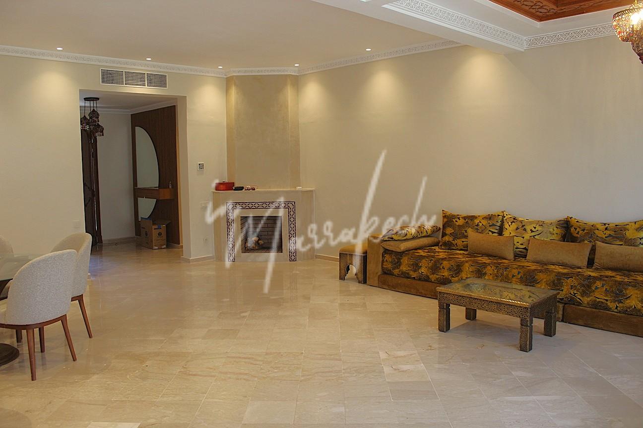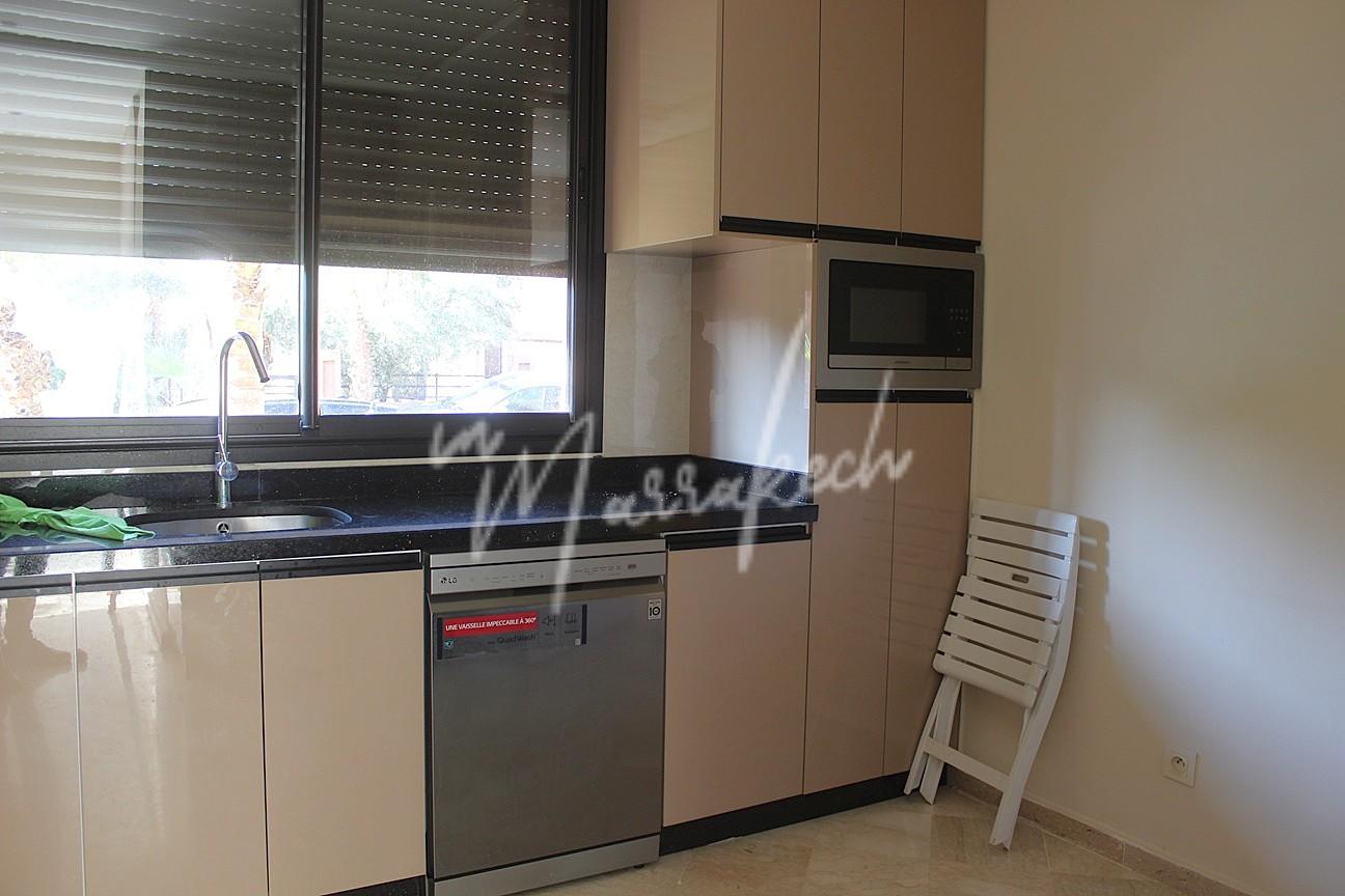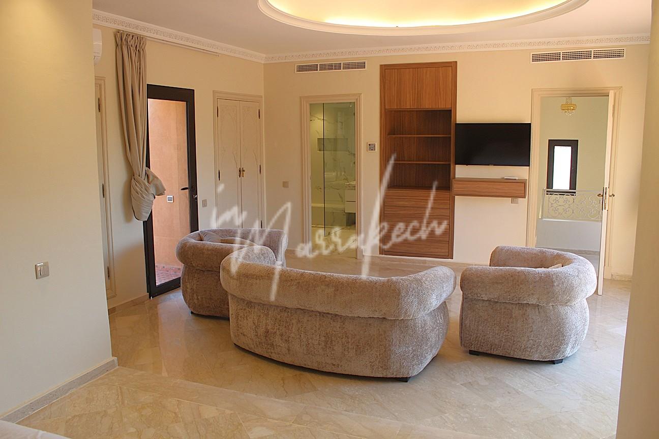 Description : Votre agence immobilière InMarrakech à le plaisir de vous proposer une jolie villa dans le domaine de River Palm comprenant une entrée, une belle pièce de vie avec cheminée avec des grandes baies vitrées en double vitrage, toilette réception, une belle cuisine, deux chambres , une salle d’eau commune aux deux chambres et à l’étage une belle chambres parentale avec salle d’eau et terrasse