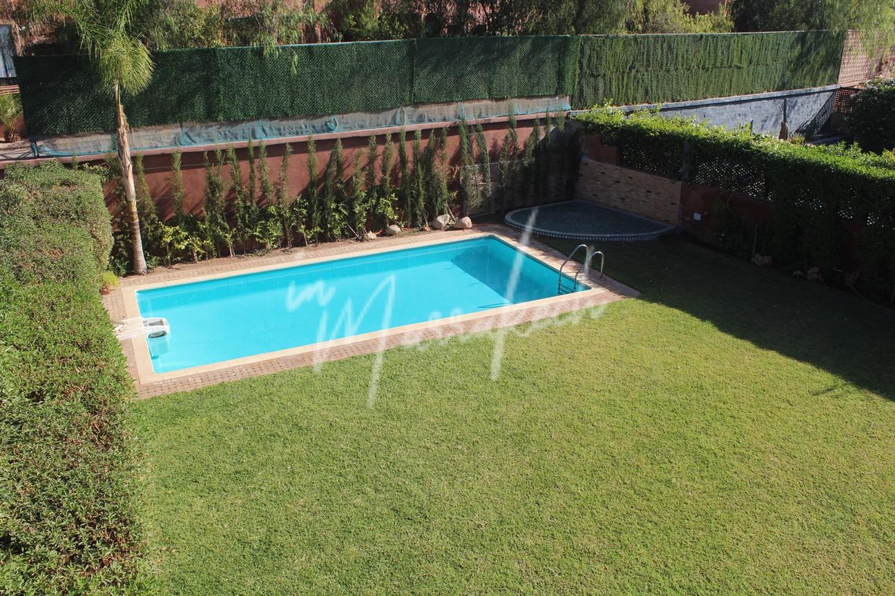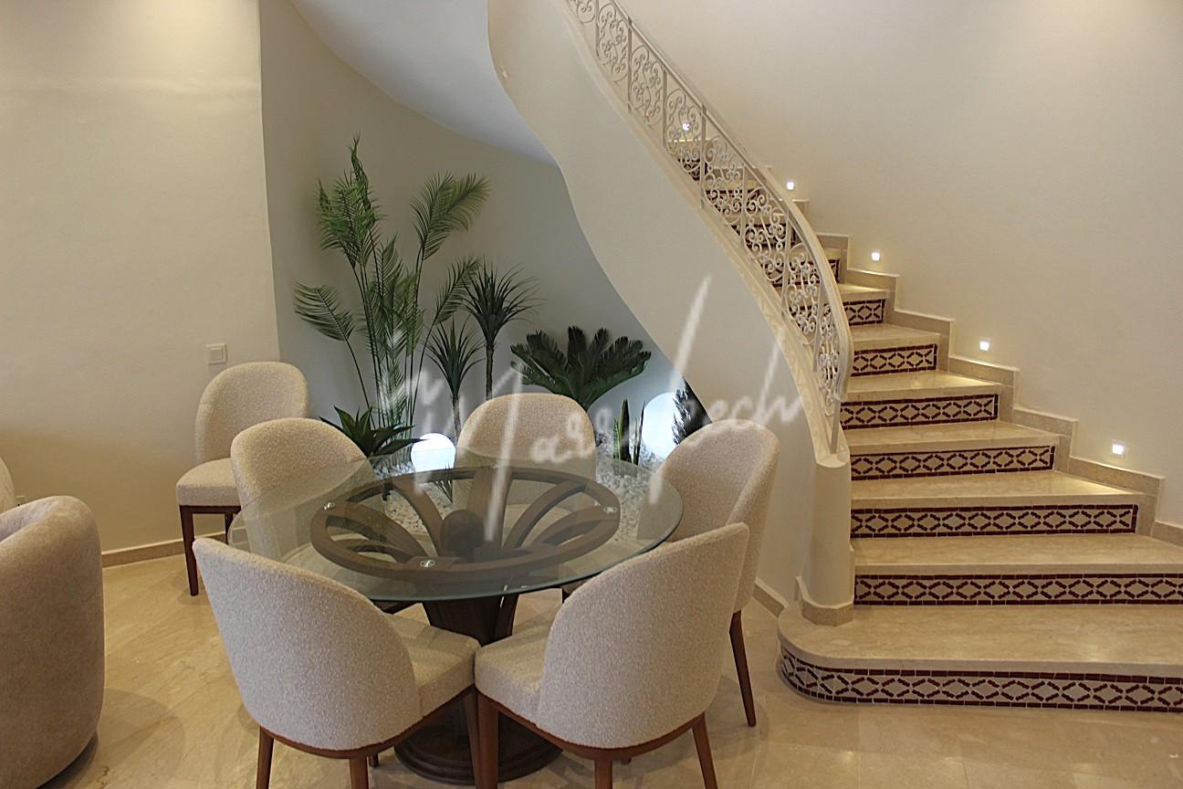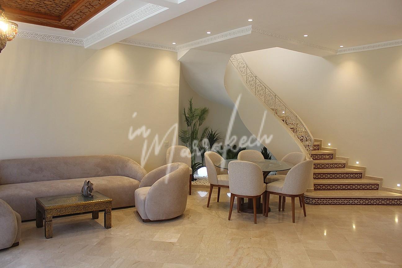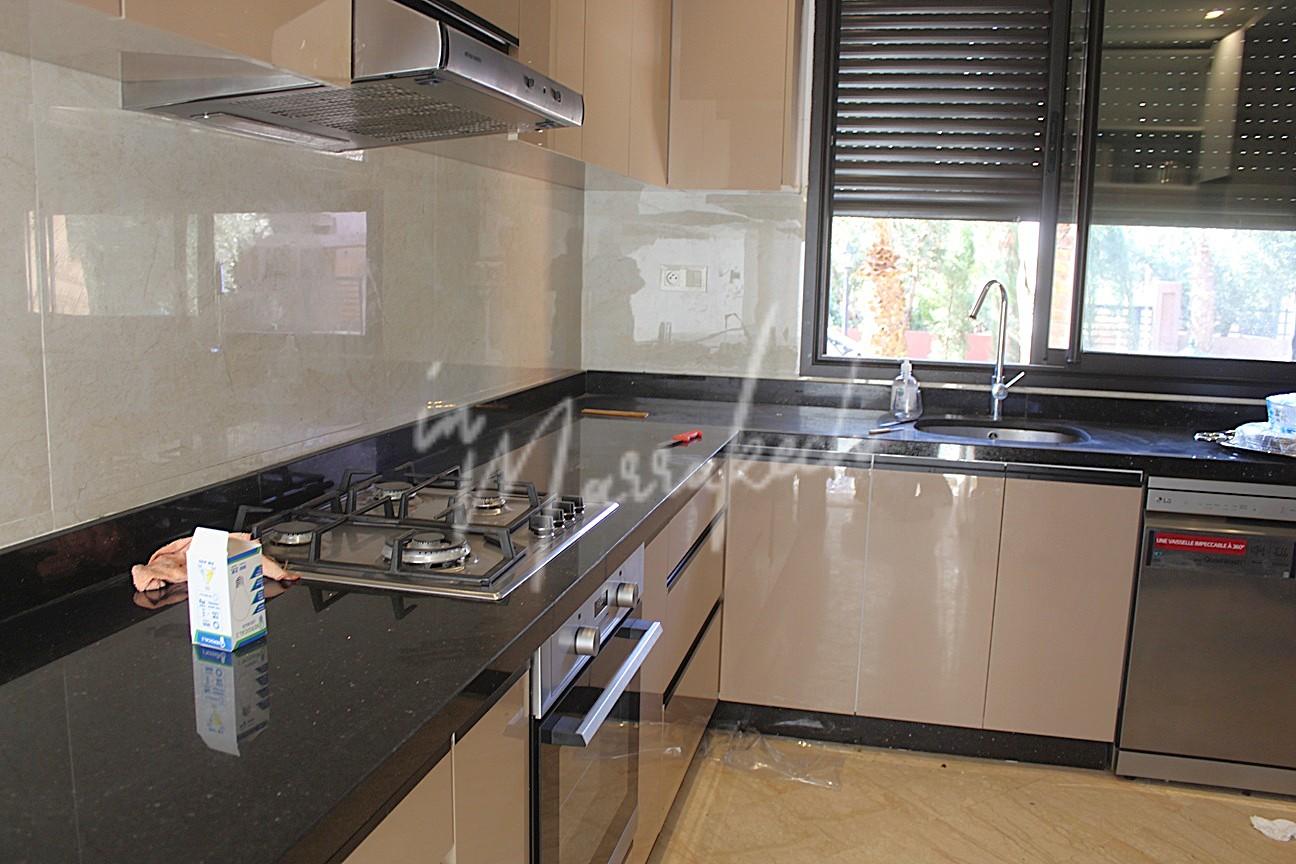 Description : Votre agence immobilière InMarrakech à le plaisir de vous proposer une jolie villa dans le domaine de River Palm comprenant une entrée, une belle pièce de vie avec cheminée avec des grandes baies vitrées en double vitrage, toilette réception, une belle cuisine, deux chambres , une salle d’eau commune aux deux chambres et à l’étage une belle chambres parentale avec salle d’eau et terrasse